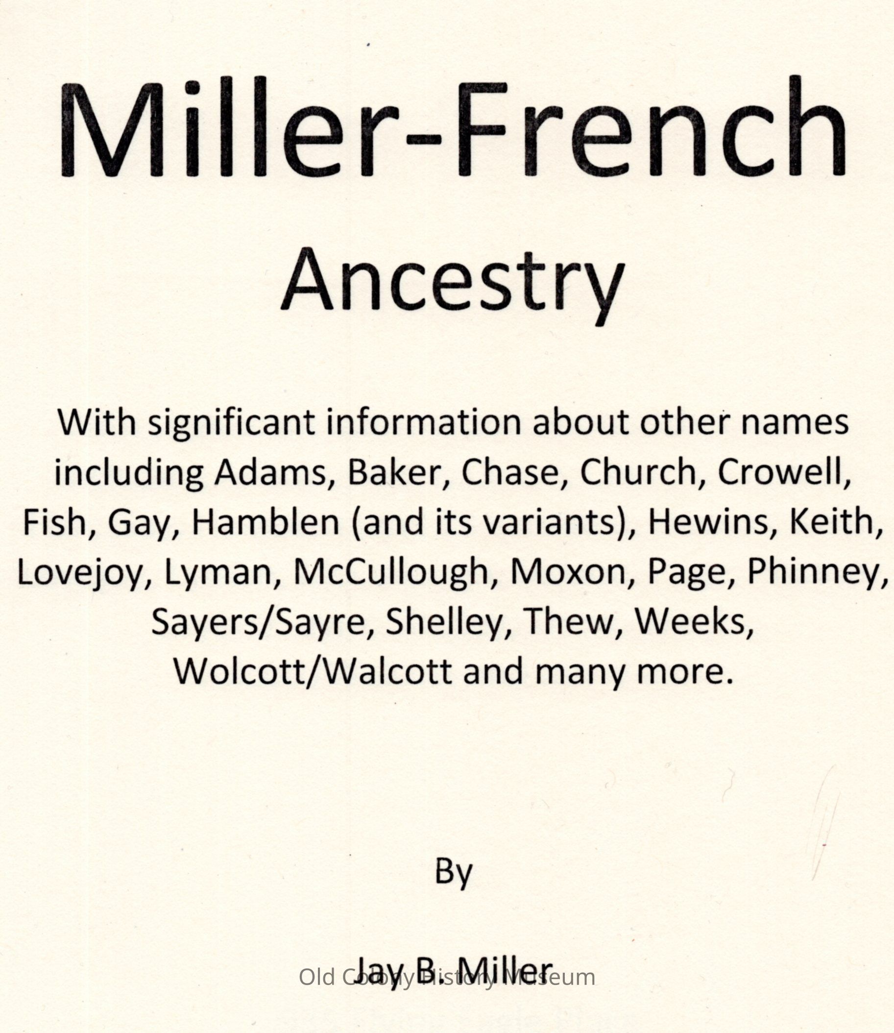 1. Miller family. 2. Massachusetts--Genealogy. 3. Taunton (Mass.)--Genealogy. 4. French family.Book Details