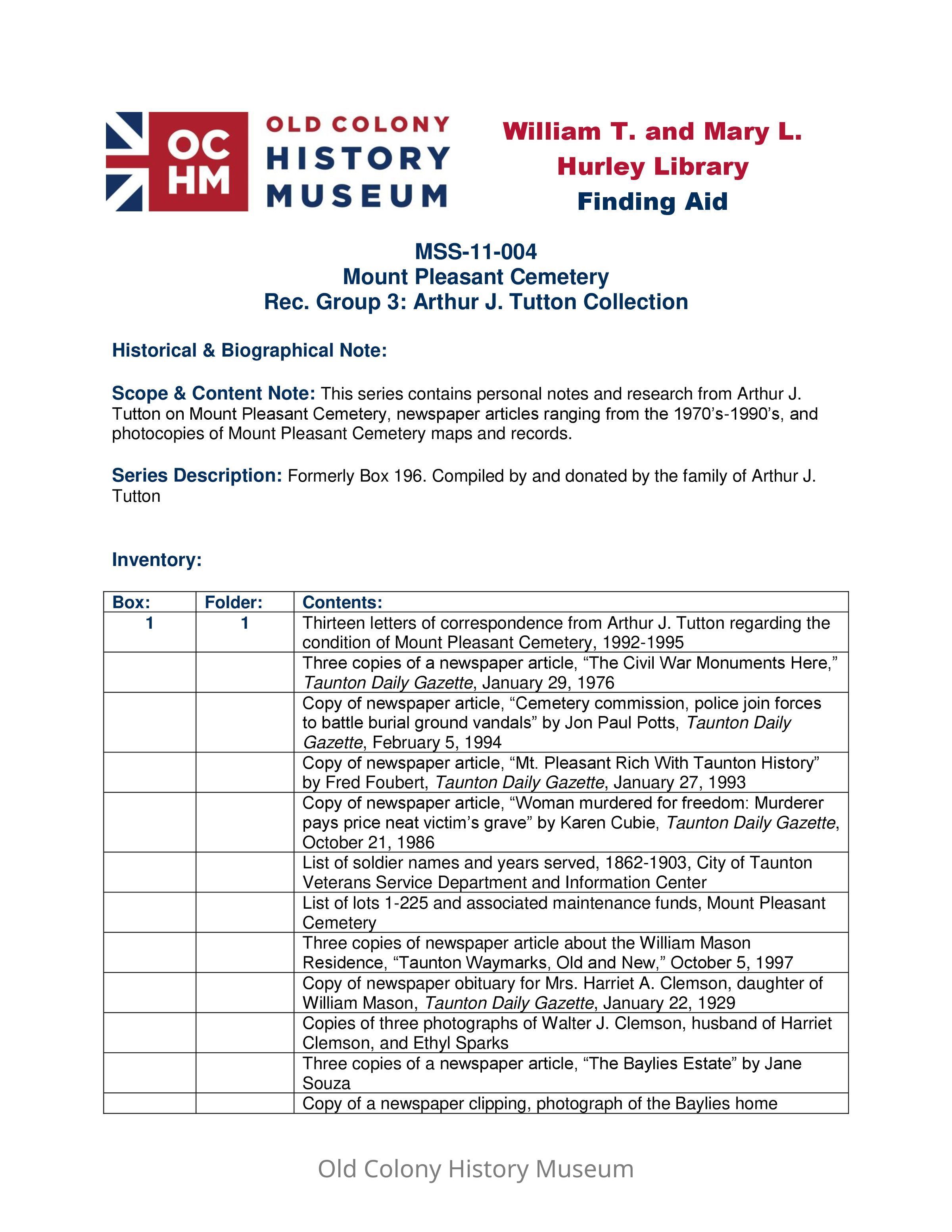 This series contains personal notes and research from Arthur J. Tutton on Mount Pleasant Cemetery, newspaper articles ranging from the 1970’s-1990’s, and photocopies of Mount Pleasant Cemetery maps and records.