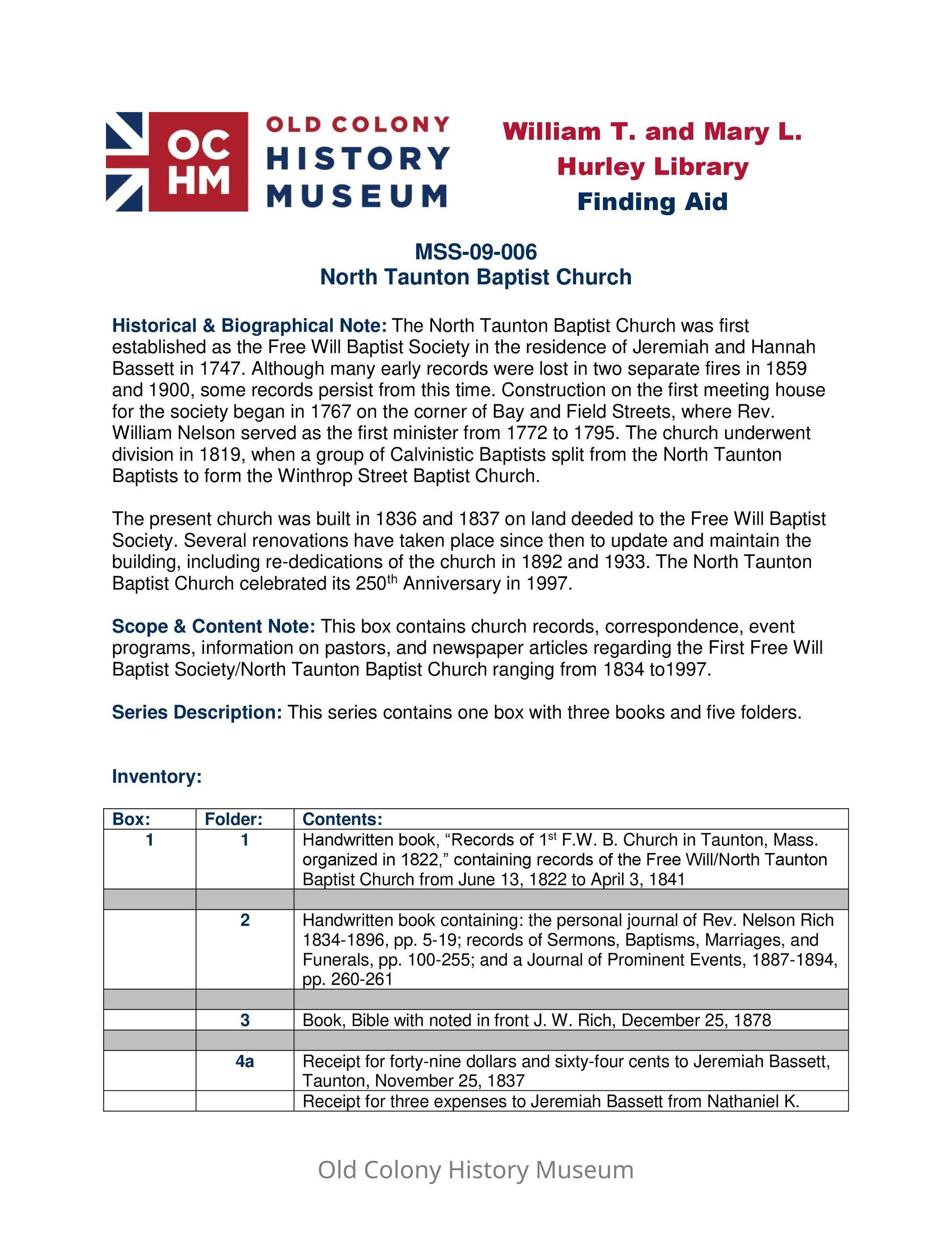 This box contains church records, correspondence, event programs, information on pastors, and newspaper articles regarding the First Free Will Baptist Society/North Taunton Baptist Church ranging from 1834 to1997.Context