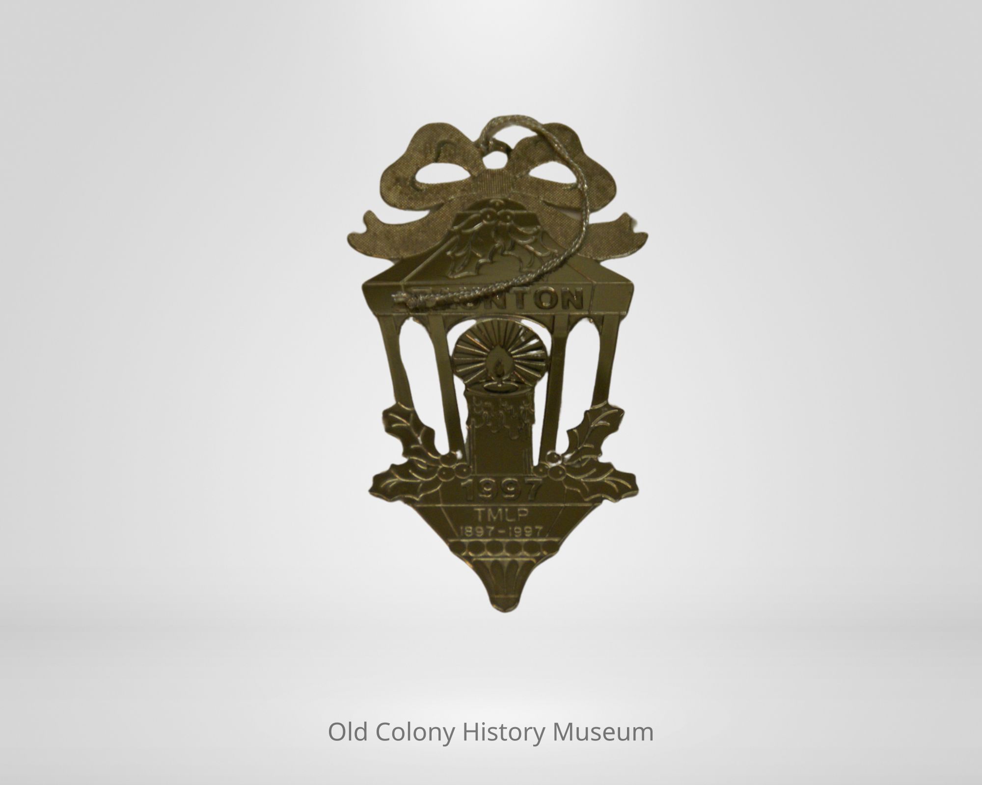 1997 Heart of Taunton ornament. Lantern shaped silver plated with engraving and openwork design showing a candle-filled lantern with folly leaf accents. "Taunton 1997 TMLP 1897-1997" engraved on face. Silver cord tie.Lexicon