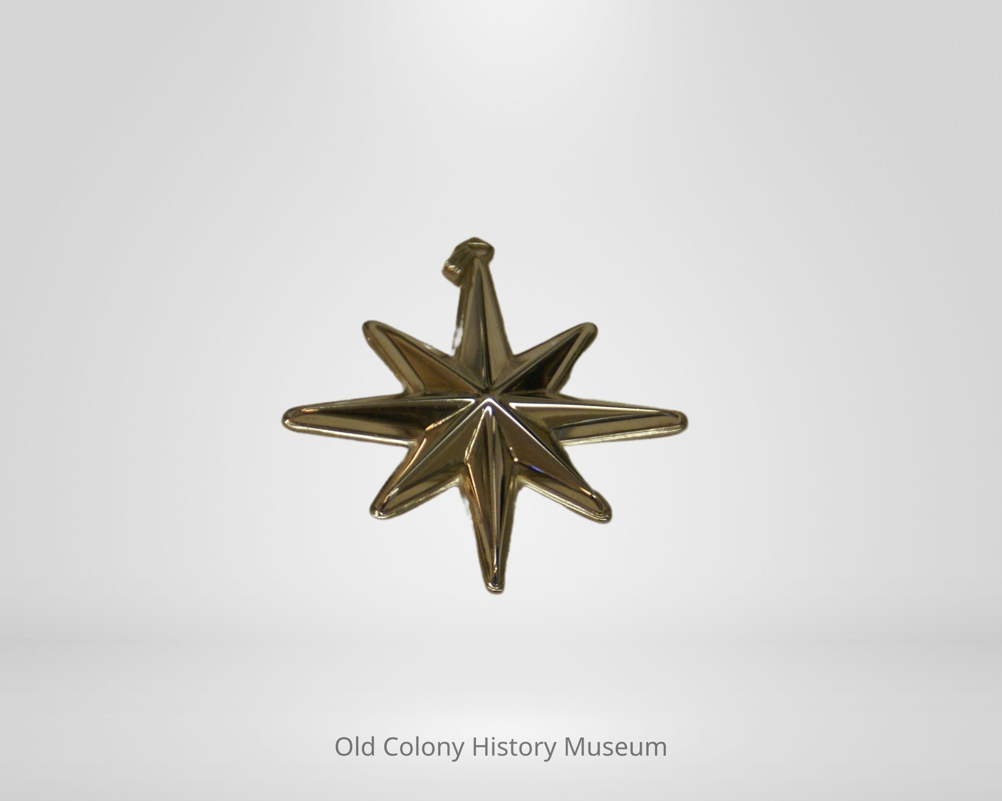 Christmas ornament, Reed and Barton star, 1976. Molded eight point star. Has "Reed & Barton copyright 1976 Sterling" engraved on satin finished back. oval cutout with bail for hanging ornament or possibly as a pendant at top.Lexicon