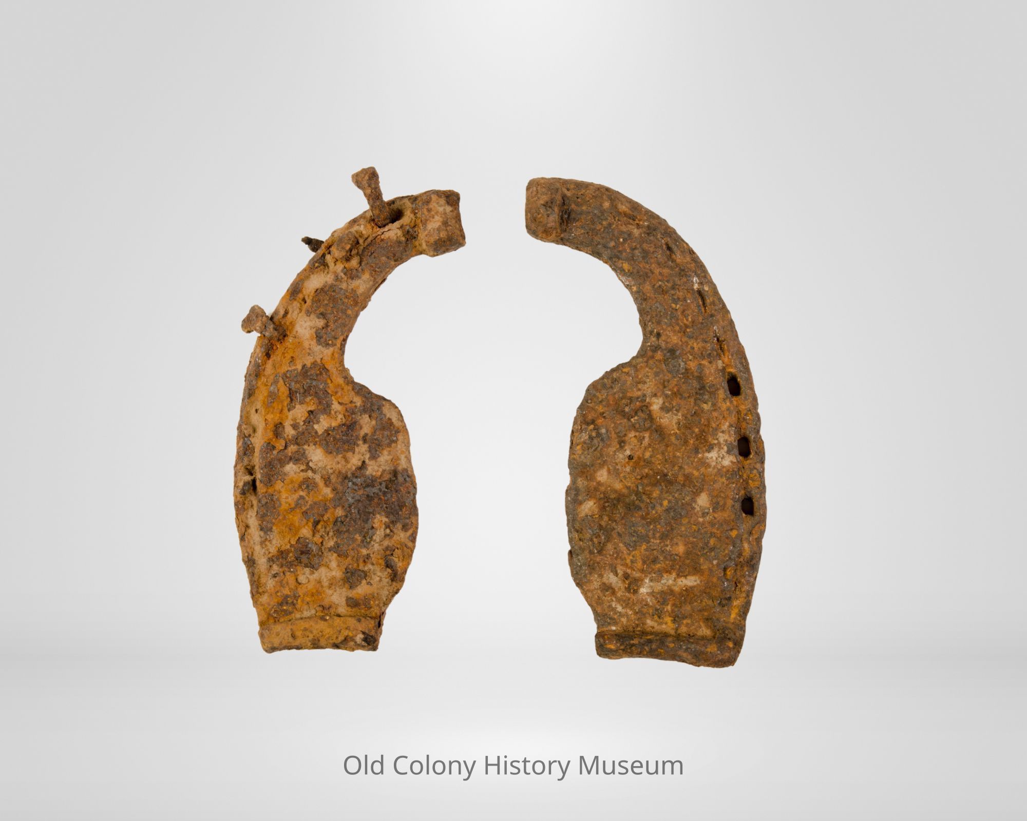 Oxen shoe broken in two pieces. Quarter sphere-shaped pieces of metal with thinner section that curves upward and thicker bottom. Pieces of nails are protruding from the oxen shoe.
