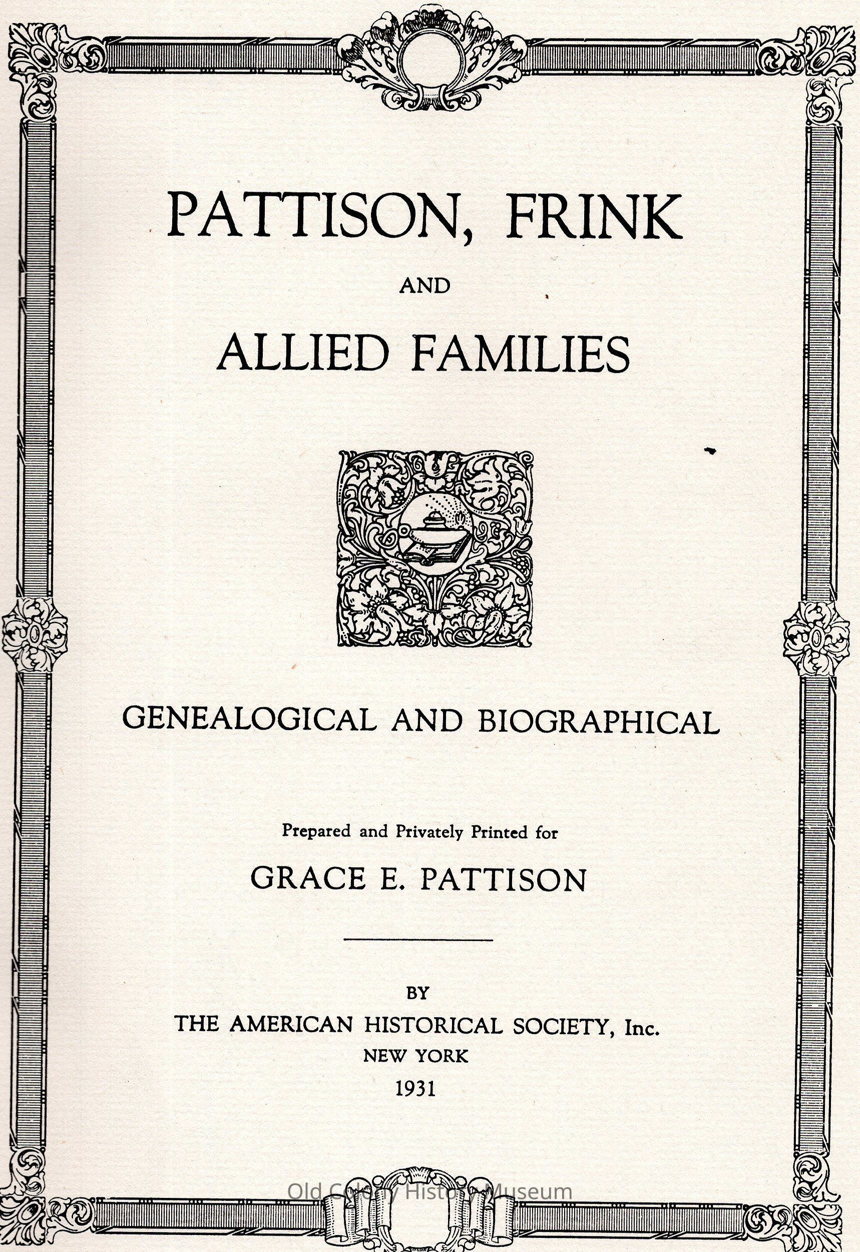 Pattison, Frink, and Allied Families, Genealogical and Biographical; Prepared and Privately Printed for Grace E. PattisonEntry/Object ID