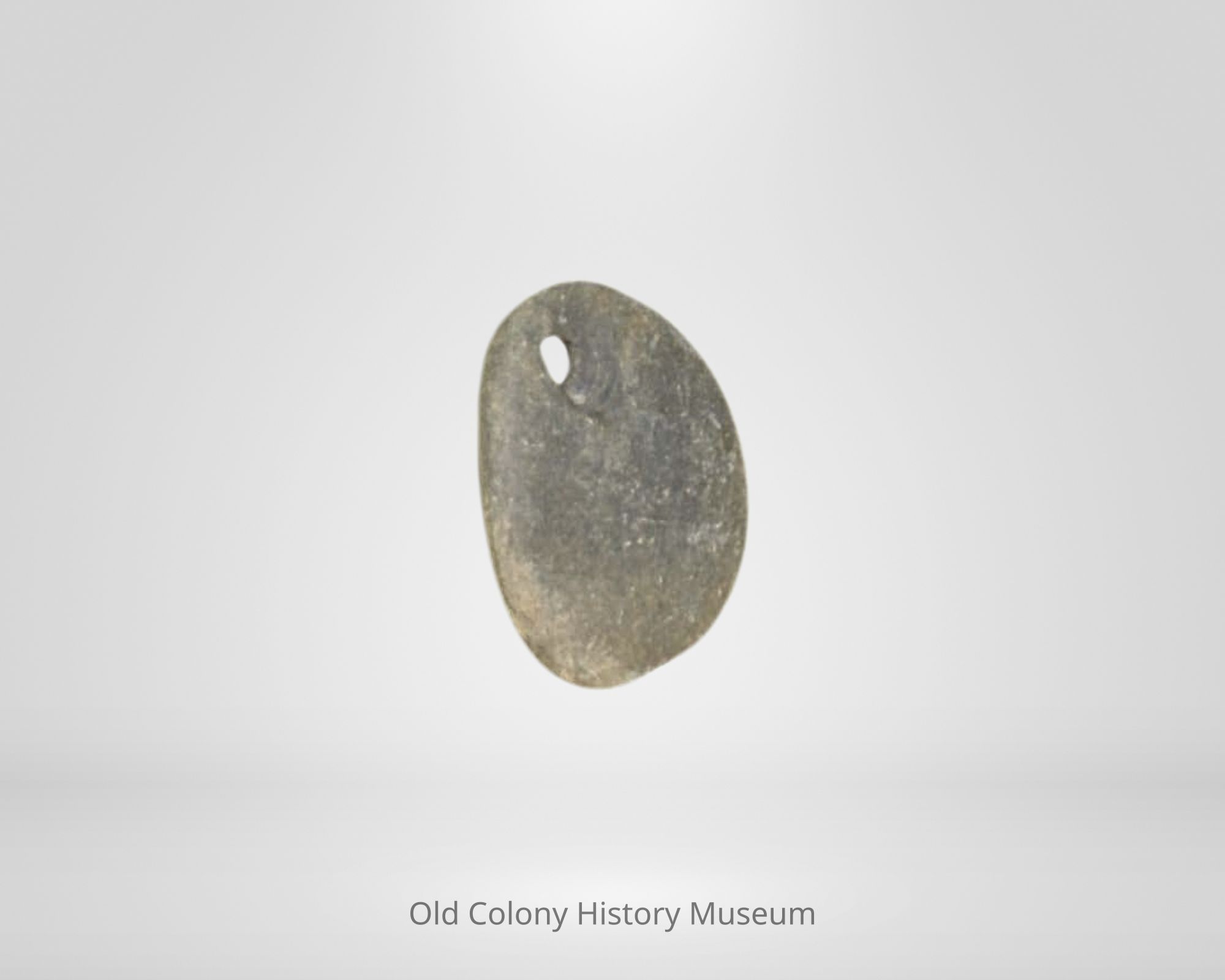 Oval disk with drilled hole in one end; rust stain on back side; beginnings of a hole appears in back alsoMade/Created