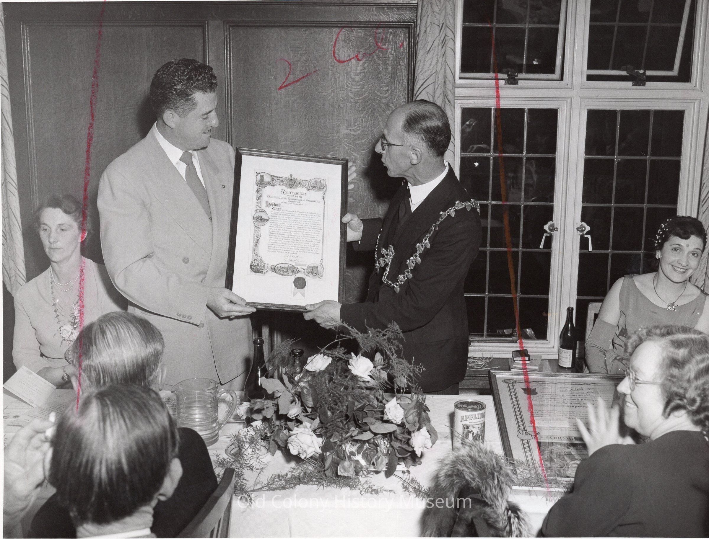 People - Mayor Parker presents engraved resolution to Taunton England Mayor Fred G. DowelEntry/Object ID