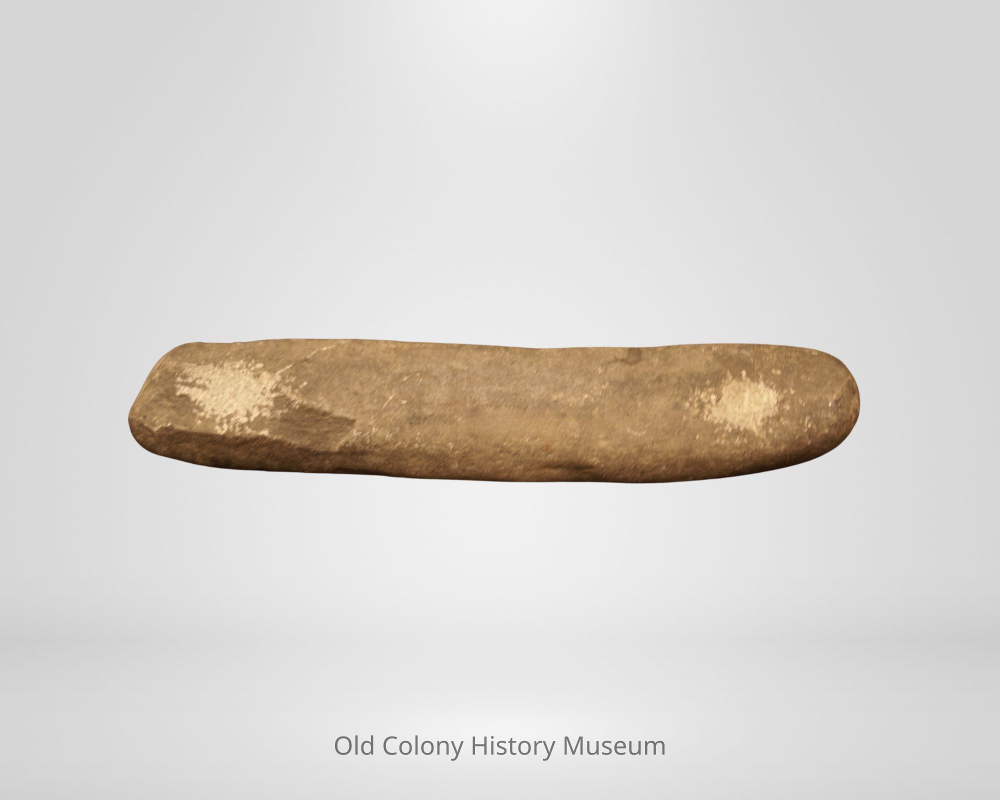 Cylindrical pestle; concave; one end broken off with several fractures; the other end round; two large areas (one at each end) discolored to light grey; other side convex with small nicks and linesLexicon