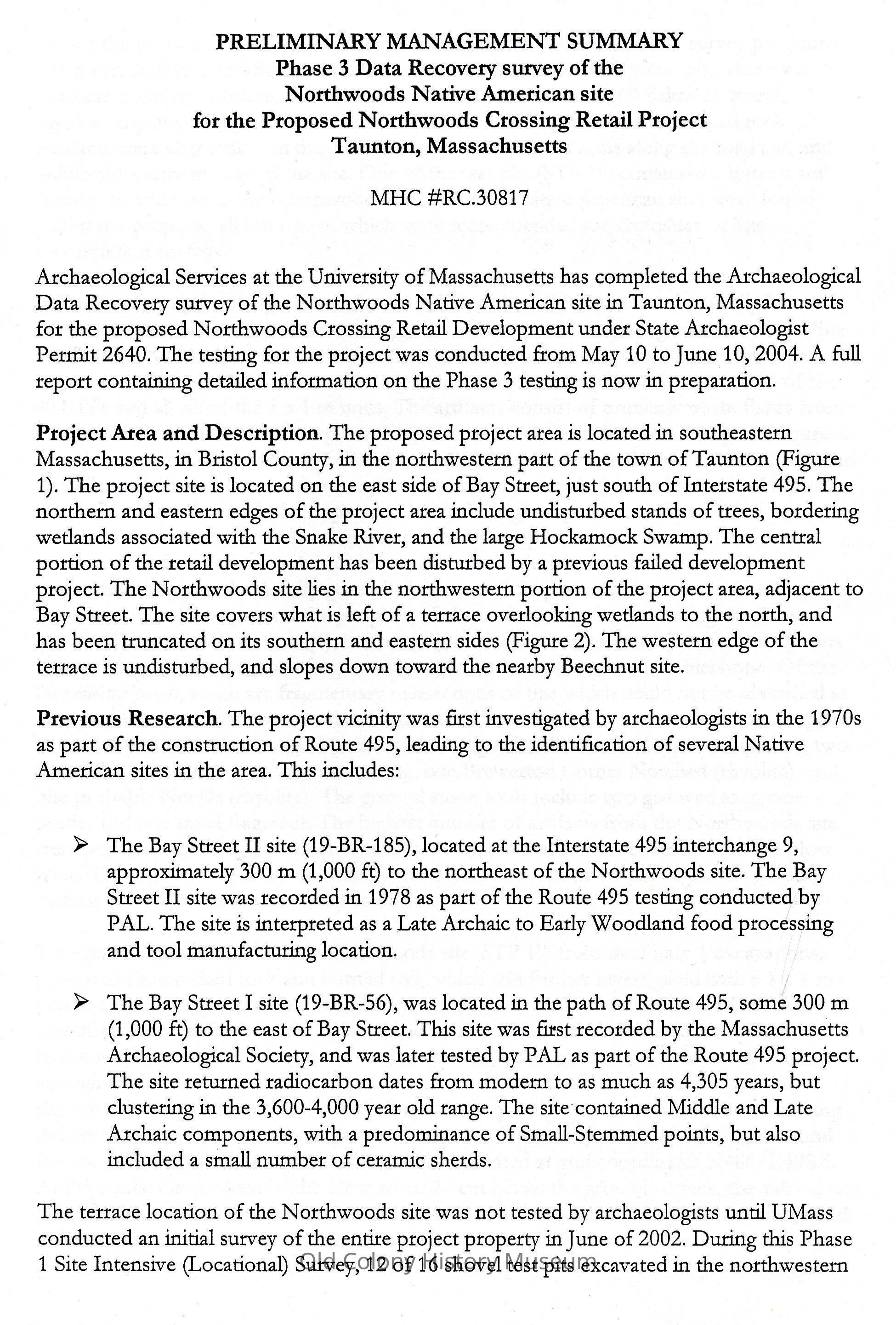 Phase 3 Data Recovery Archaeological Servey of the Northwoods Native American Site for the Proposed Northwoods Retail Development, Taunton, MassachusettsEntry/Object ID