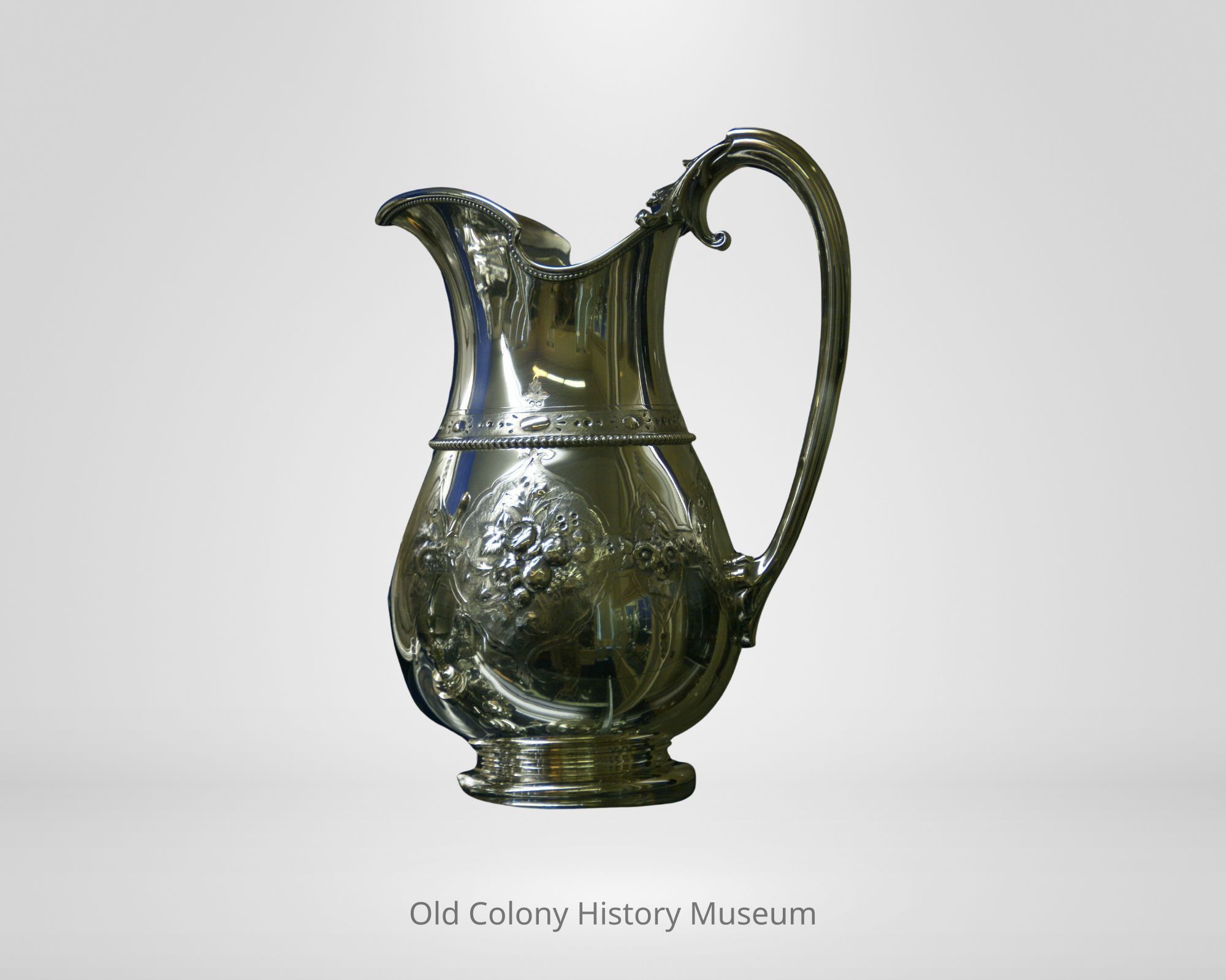 Pitcher with floral repousse shields off set by punch work. Front shield engraved with gothic initials "C.J.H.B. from S.L.K." Beading at base of neck and at flared rim. Single cartouche handle ending in cast leaf spray.