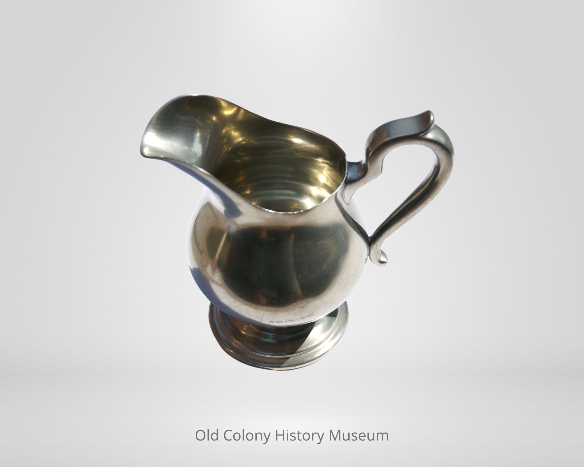 Creamer with curved handle with flourish near top and ogee base. Bottom of base is open.