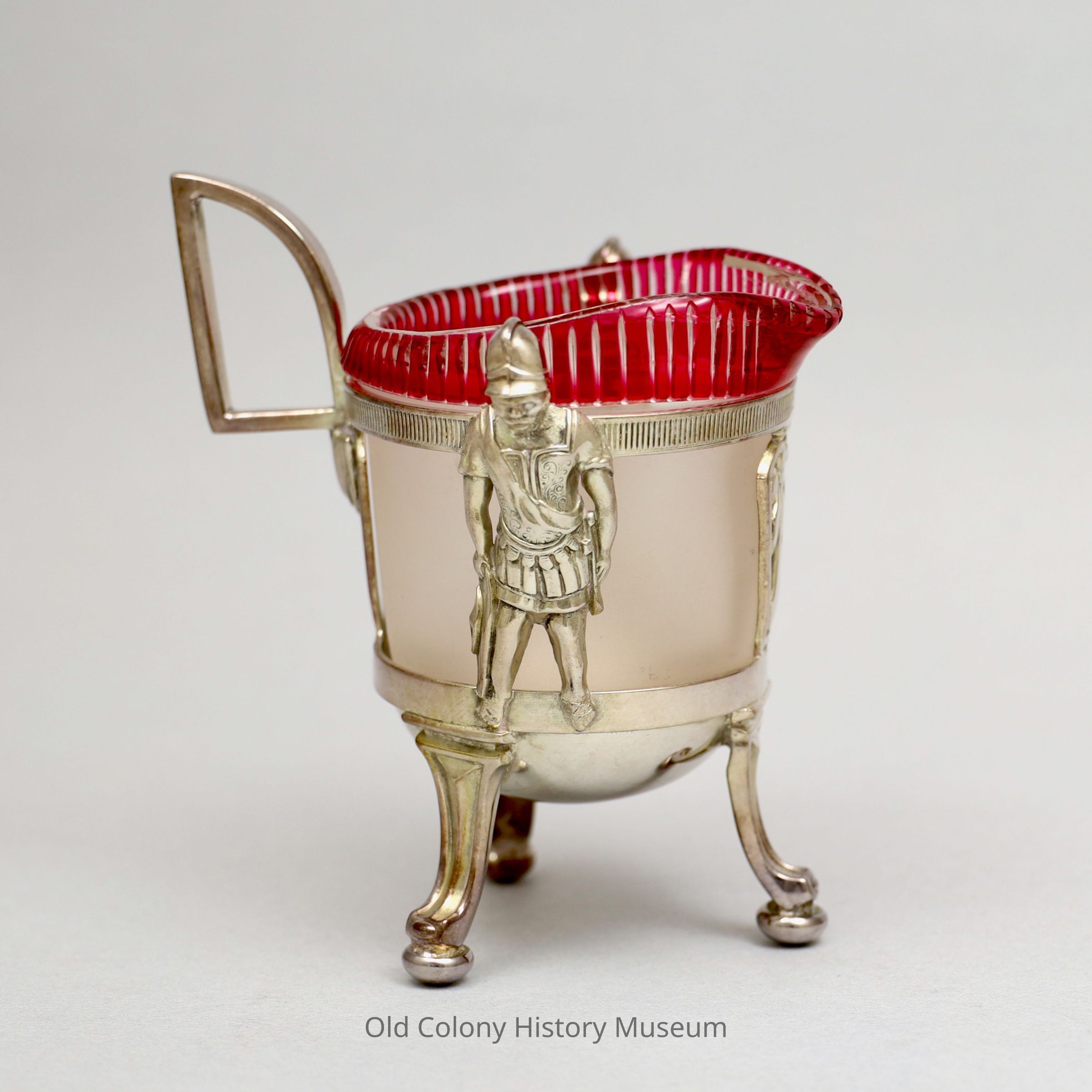 Silver plated creamer, glass lining. Curved legs and reeded rim. Roman Centurions accent the piece. Circular frosted glass liner with red fluted rim. Group of 1959.21-23 go together.Lexicon