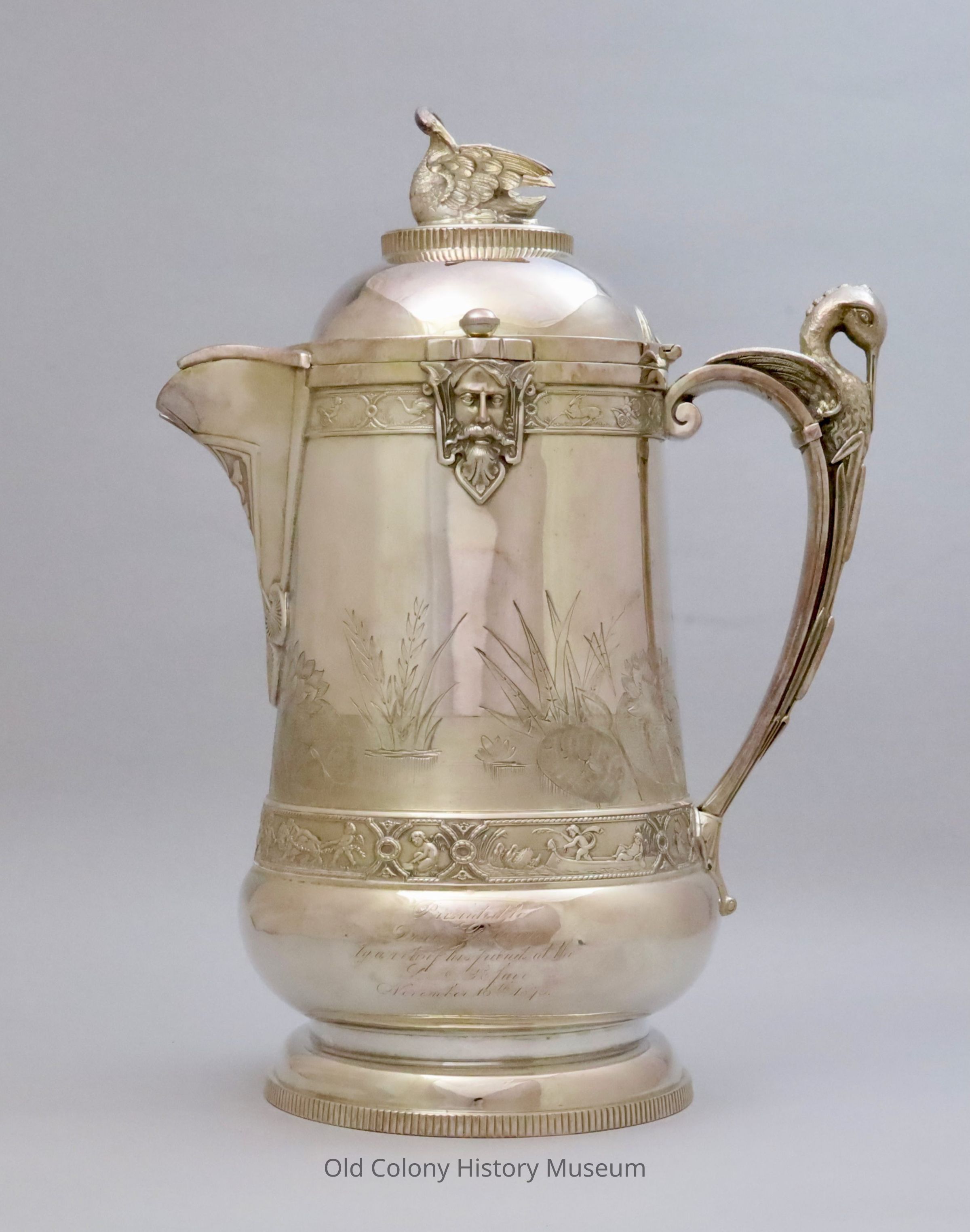 Silver ice pitcher, made by Reed & Barton. Baluster shaped ice water pitcher engraved "Presented to Denis Galligan by a vote of his friends at the G.A.R. fair November 18th 1875". Scroll handle with modeled waterfowl and cattails. Tapered triangular spout accented with arabesques and crossed lotus leaves. Body of pitcher has engraved design of pond lilies, cattails and foliage. Band above has alternating antelope, butterfly and ostrich pulled chariots containing cherubs, also two modeled bearded men. Band below features cherubs engaged in various activities. High doomed lid with reeded band waterfowl finial; reeded band repeated on stepped base.Made/Created