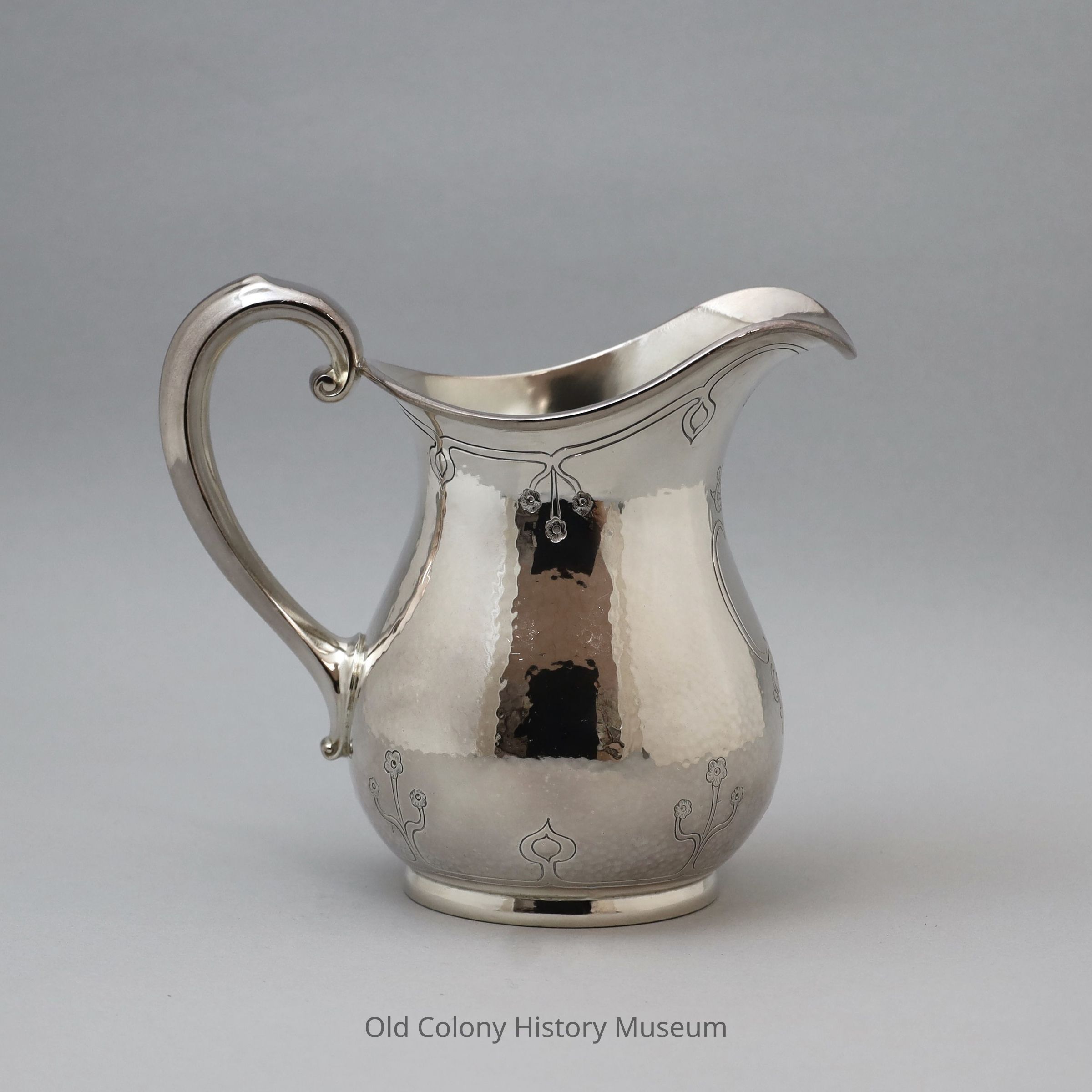 Water pitcher that is hammered and chased with cast handle and blank presentation crest.