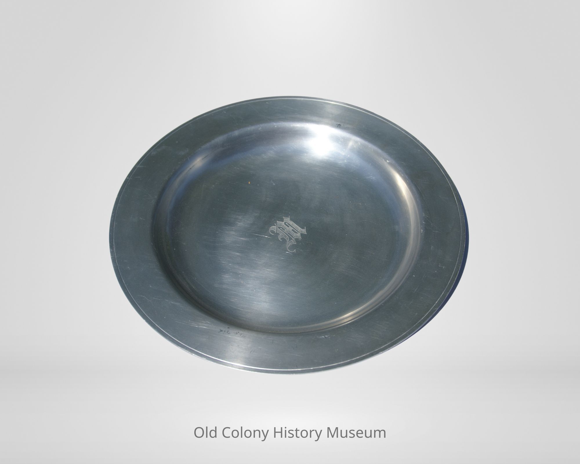 Plate with beveled rim and shallow base. In the center, a "M" monogram is engraved. Material could be aluminum, a metal LV used around WWII. Markings omit the word 'pewter' that he usually incorporated into the majority of his pewter pieces, leading to the consideration that this may be aluminum. In addition, LV also carried a lighter post-war 1930's, "Berkeley" pewter line, although these were normally marked as such.Lexicon