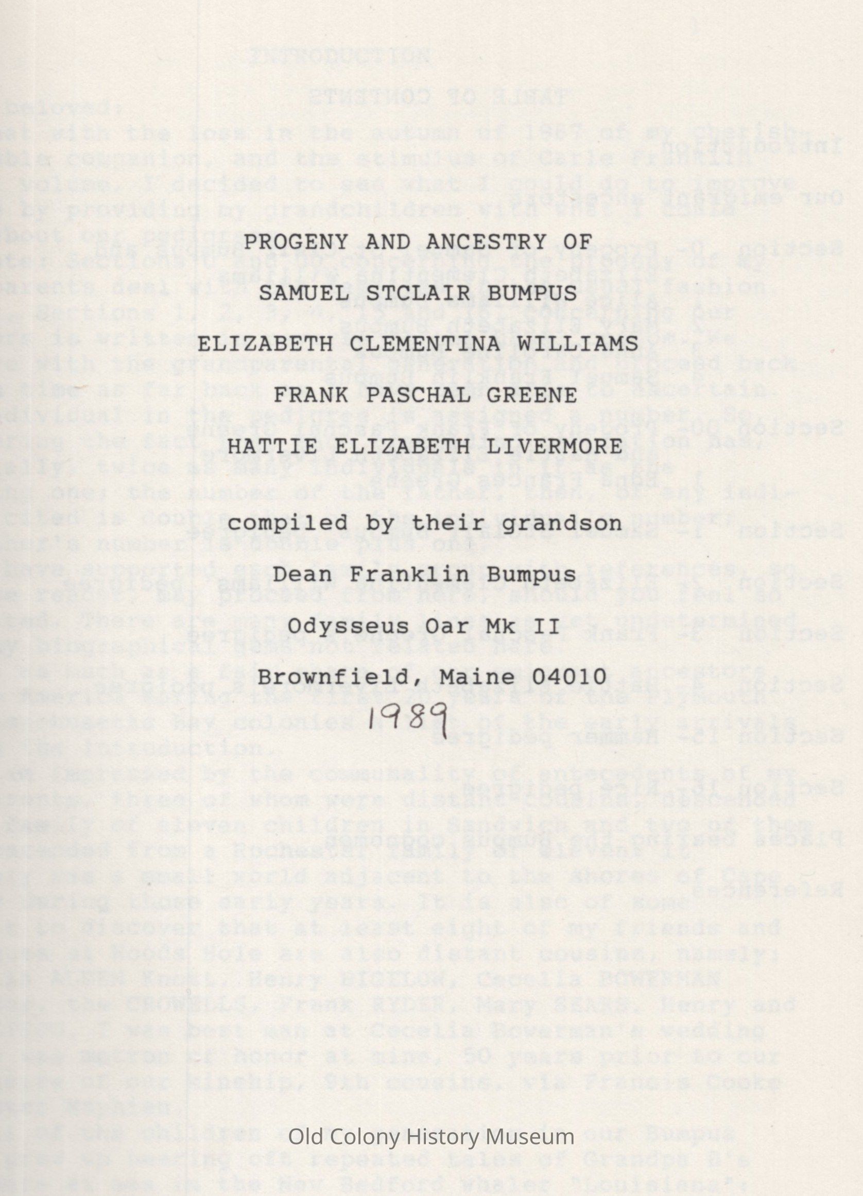 Progeny and Ancestry of Samuel St. Clair Bumpus, Elizabeth Clementina Williams, Frank Paschal Greene, Hattie Elizabeth LivermoreEntry/Object ID