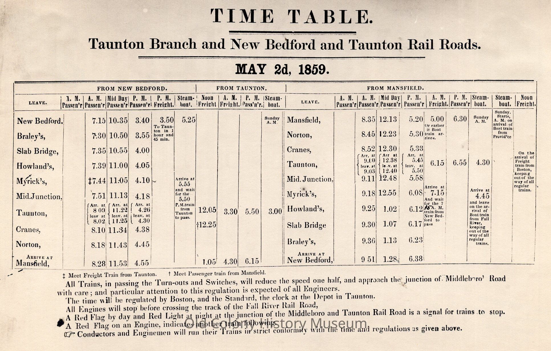 Railroads - Taunton Railroad Time Table - 1859