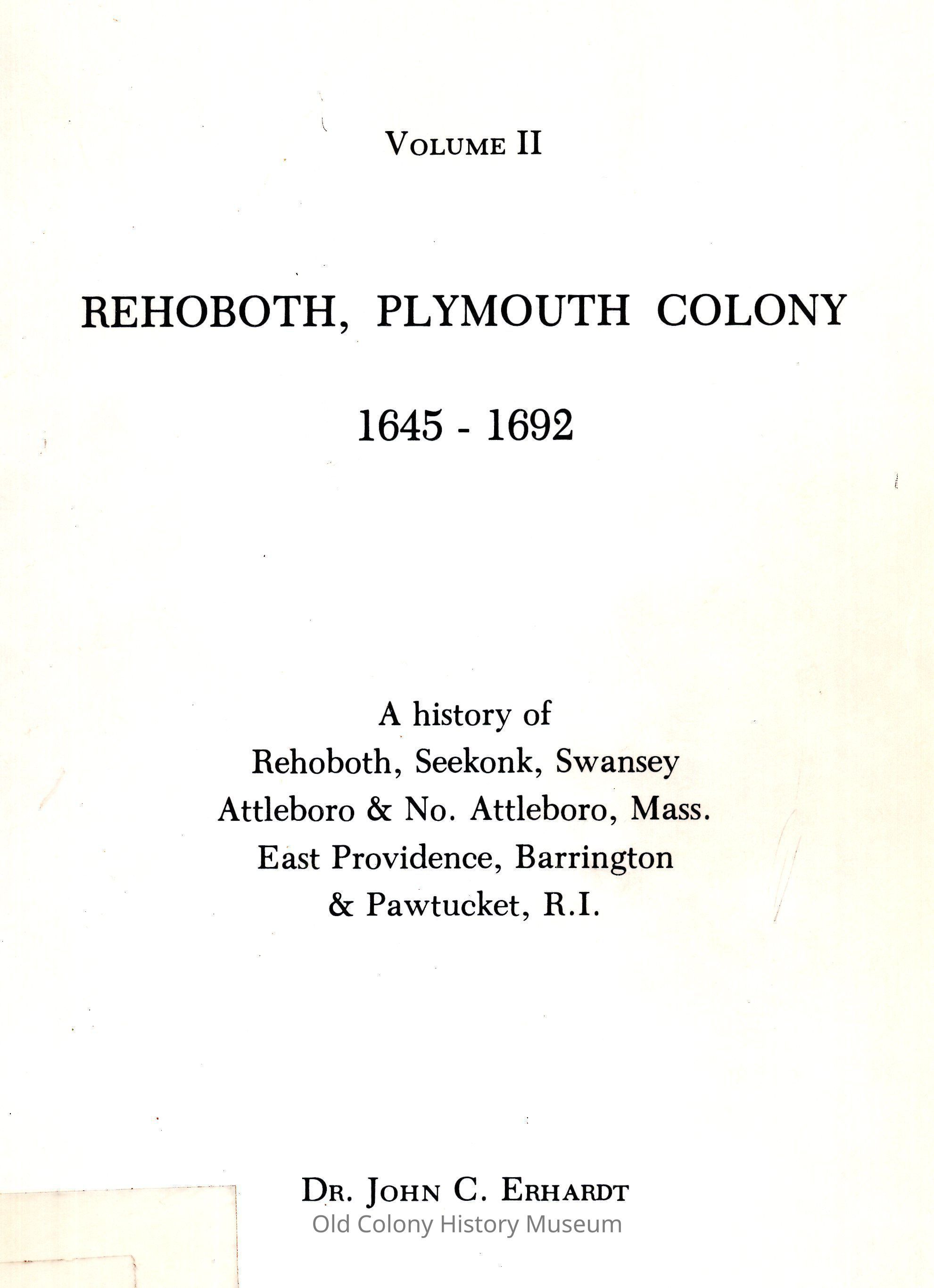 Rehoboth, Plymouth Colony 1645-1692: Volume 2: a History of Rehoboth, Seekonk, Swansey, Attleboro and North Attleboro, Mass., East Providence, Barrington and Pawtucket, R.I.Entry/Object ID