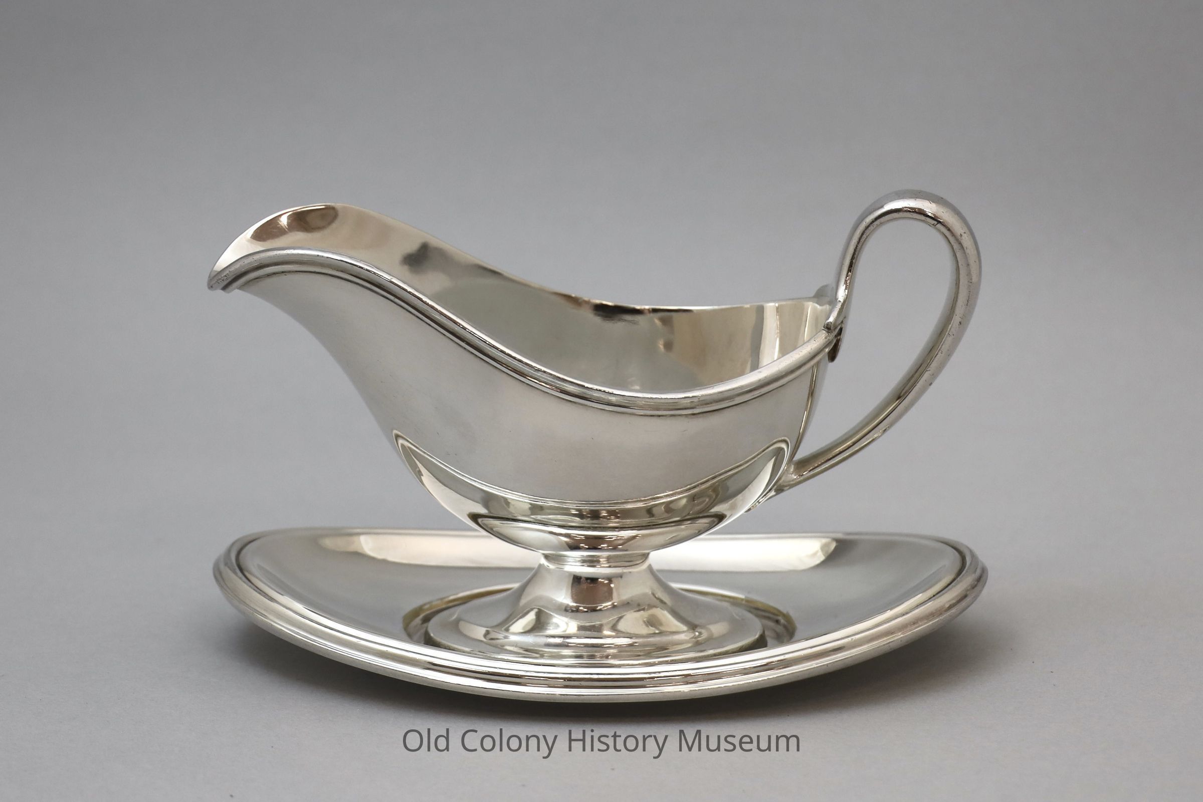 Reed & Barton electroplated gravy boat and undertray. (a) Helmet shaped souse boat with smooth plain service and double molded rim. Ear shaped handle and flared spout. Hollow domed base with molded edge. (b) Elliptical shaped tray with rolled rim. Shallow well and upturned ends.Lexicon