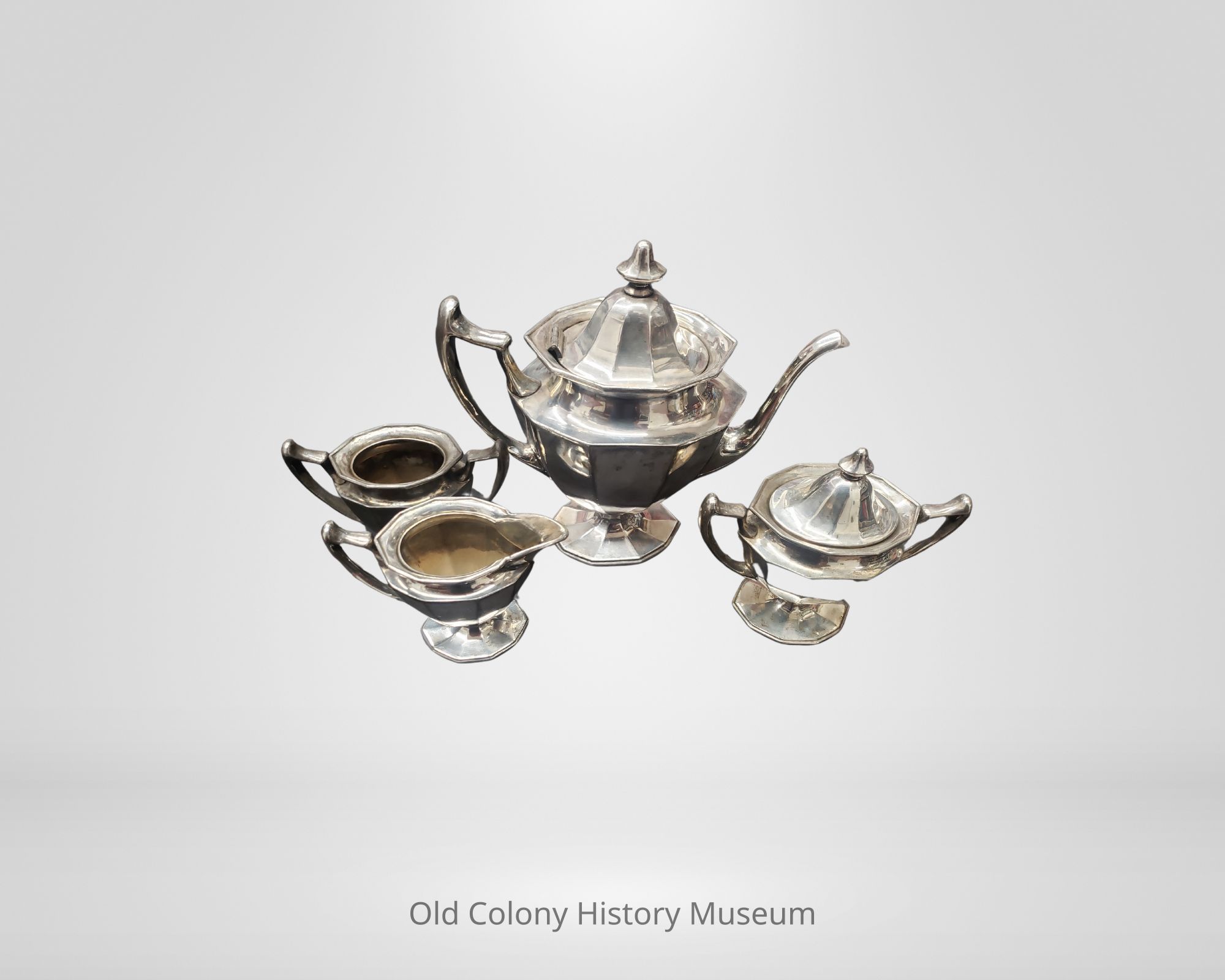 A: Silver plated teapot; simple, eight-sided design on body, base and lid; lid is attached to the body with a hinge; spout and handle soldered to the body; marked under the base "F.B. ROGERS SILVER COMPANY TAUNTON, MASS 4216."