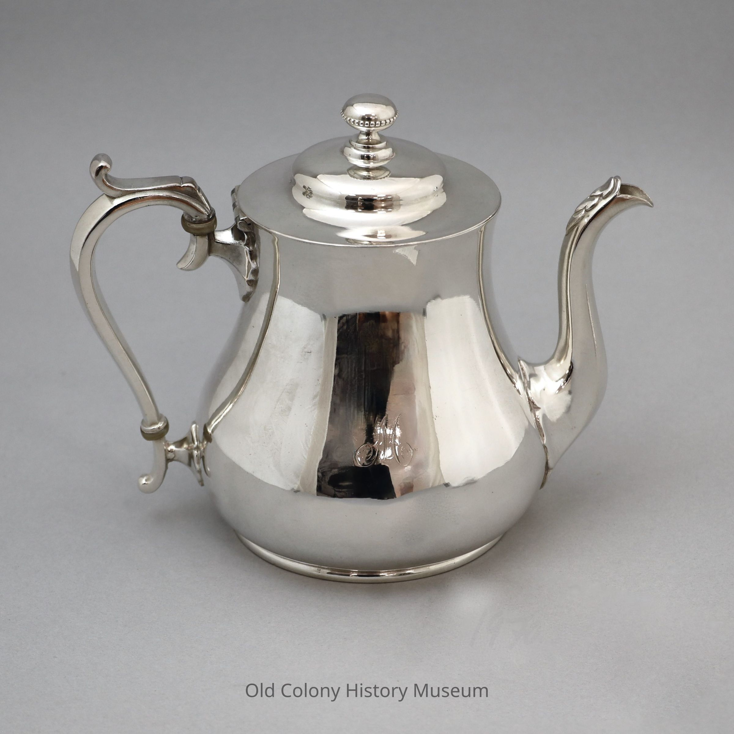 Reed and Barton silver tea set: teapot, sugar bowl( with no cover), creamer, waste bowl, #1985. Single beaded finial. Cast spouts and insulated handles. Each engraved with "M."Lexicon