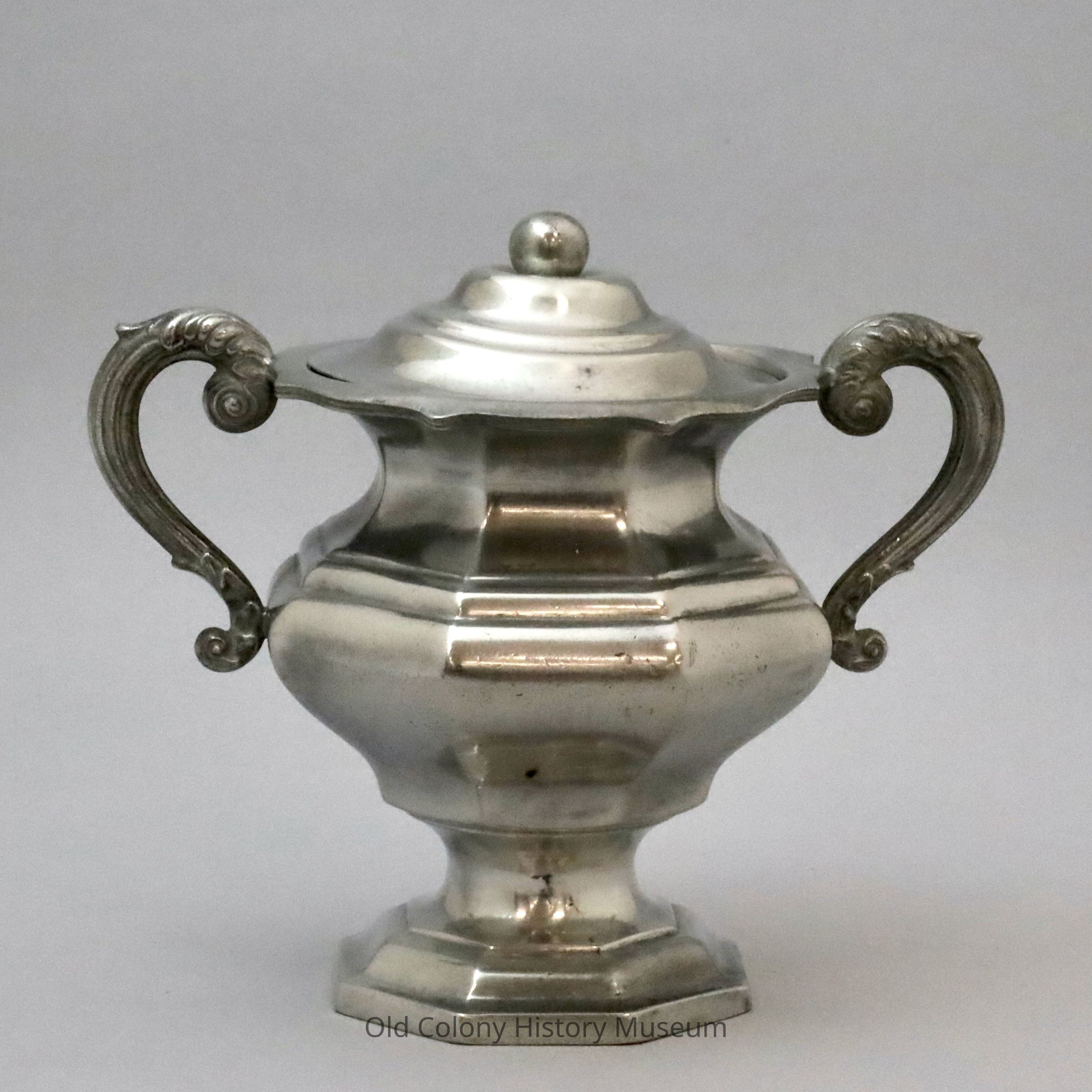 Tea set. (e) Octagonal container with flared scalloped edge and two molded handles with leaves and incised accenting. Stepped lid with round ball finial. Marked: "Leonard, Reed & Barton."Lexicon