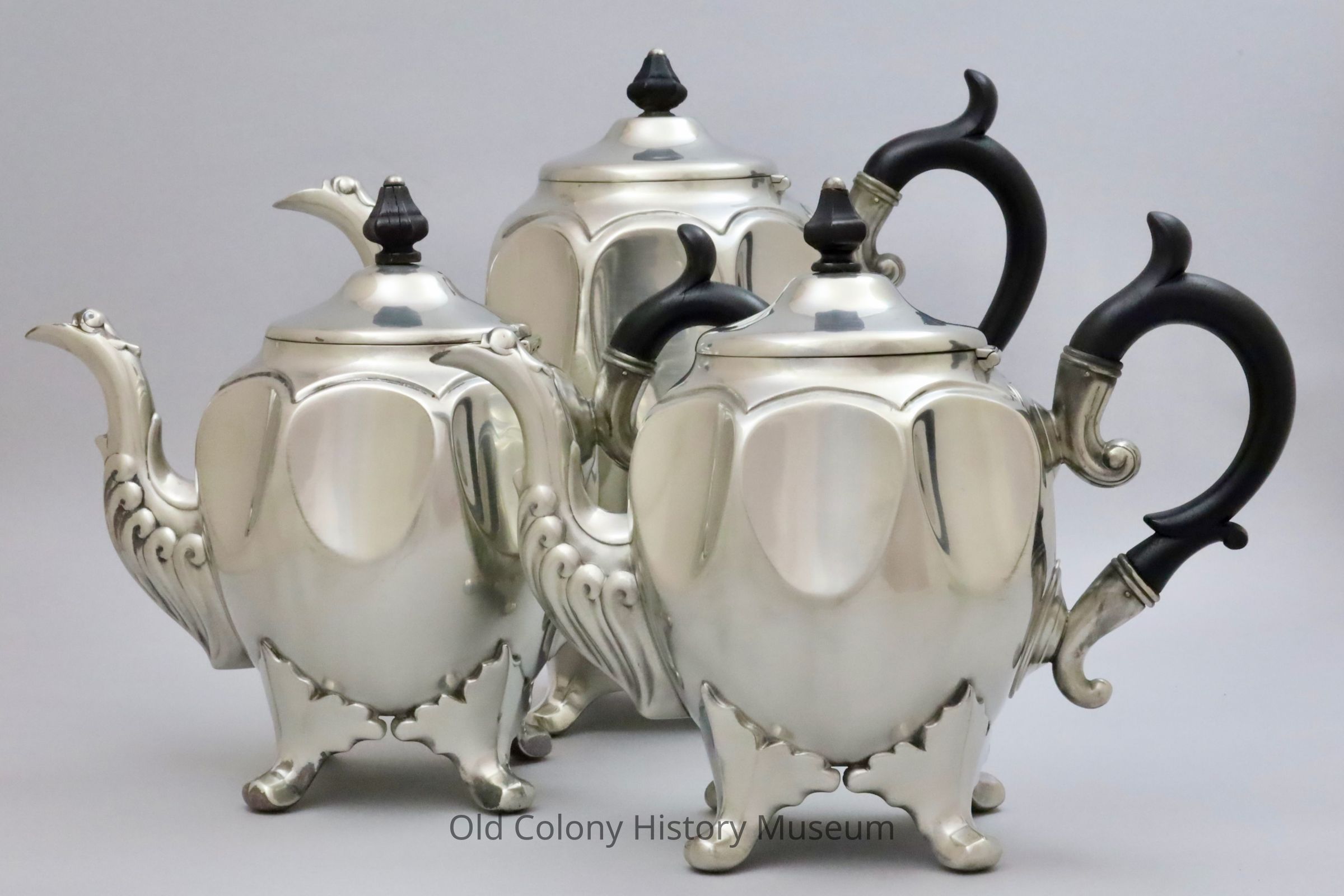 Three piece Britanniaware tea set. (b) Teapot All three pieces have an indented thumbprint pattern on the body, cast feet, and spout with bird-like feathers at base of neck. Wooden handles and hexagonal finials painted black.Lexicon