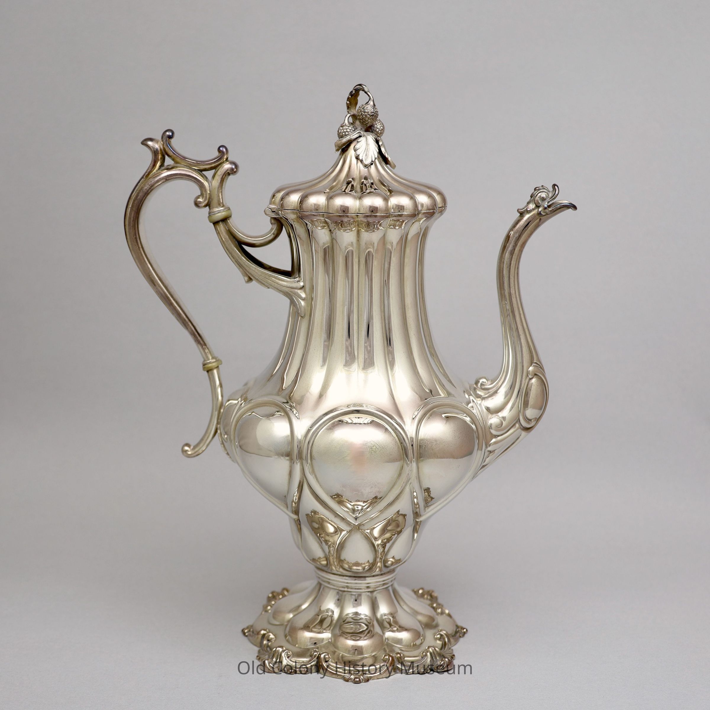 Tea set composed of: a) coffee pot, b) tea pot, c) water pot, d) sugar bowl/cover, e) waste bowl, f) cream pitcher. Each with bulbous body with fluted lobes continuing through lids. Handles formed by alternating cyma curves. Strawberry and leaf cast finials. Cast handles and spouts with head of bird motif.Made/Created