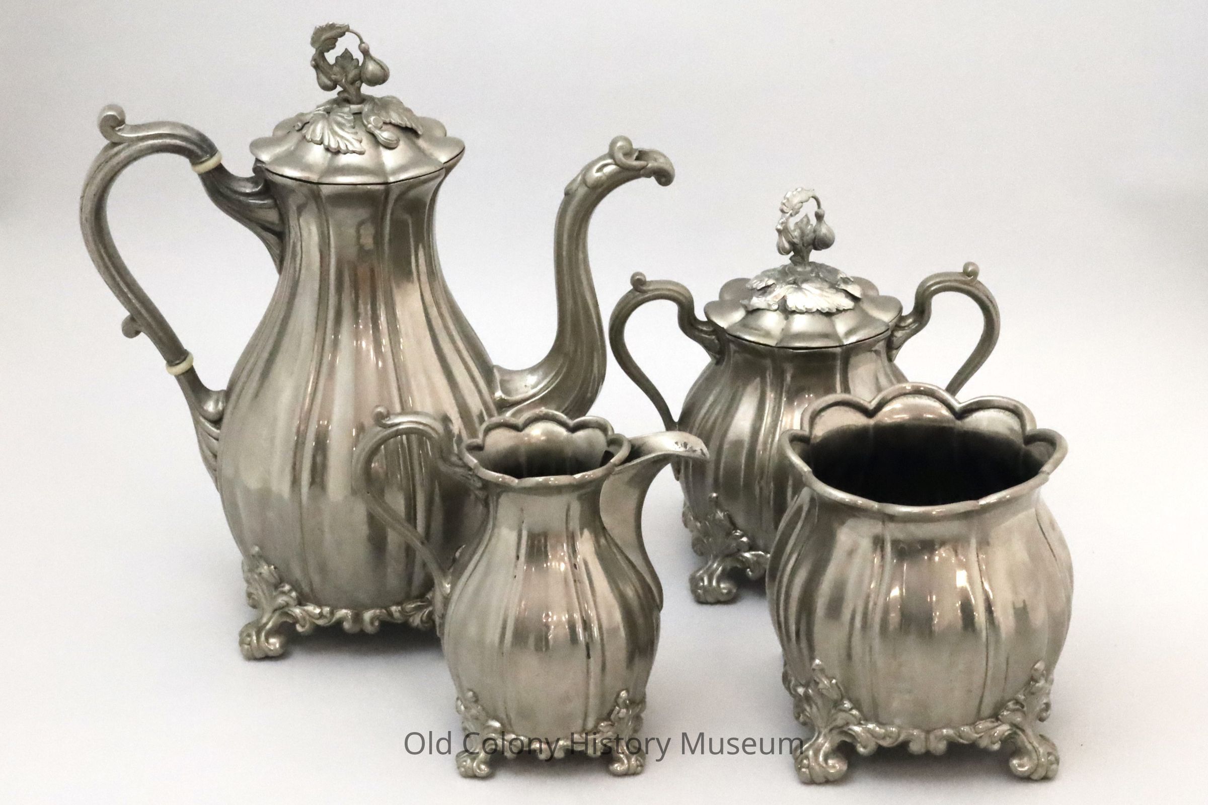 Four piece britanniaware tea set, Reed& Barton. (a) Teapot with ribbed melon-shaped body and scalloped rim. Four acanthus leaf and scroll feet. Ear shaped handle with scroll spurs and two ivory ferrules. S-shaped spout with Fleur-de-lys and scroll accents at tip. Hinged domed lid with scalloped edge and foliated pendant fruit finial.
