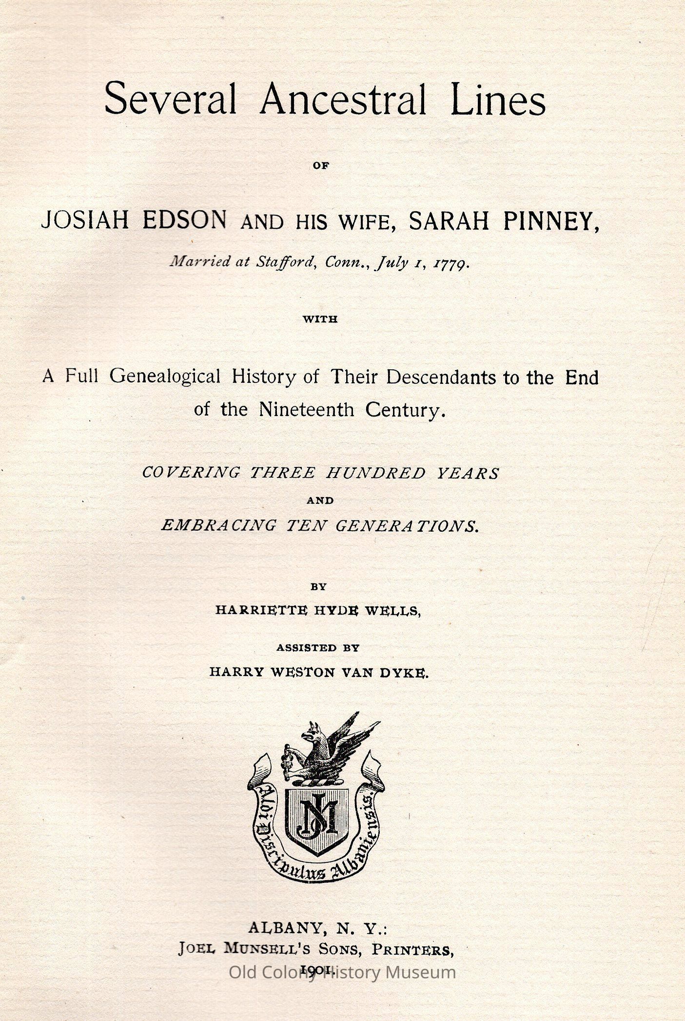 Several Ancestral Lines of Josiah Edson and his Wife, Sarah Pinney, Married at Stafford, Conn., July 1, 1779. With a full genealogical history of their descendants to the end of the nineteenth century. Covering three hundred years and embracing ten generations.Entry/Object ID