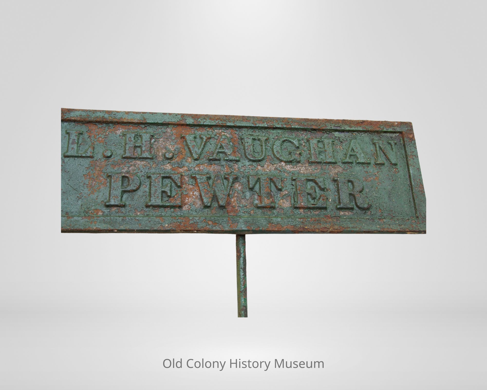 Outdoor metal sign that would be put into the ground. Long stake base with metal deterioration up to level it was underground. At top, a rectangular sign is attached, reading "A.L. Dean Co./ Taunton, Ma." on back and "L.H. Vaughan/ Pewter" on front. Words are raised lettering. Entire sign is painted with forest green paint, although it has flaked off considerably.Lexicon