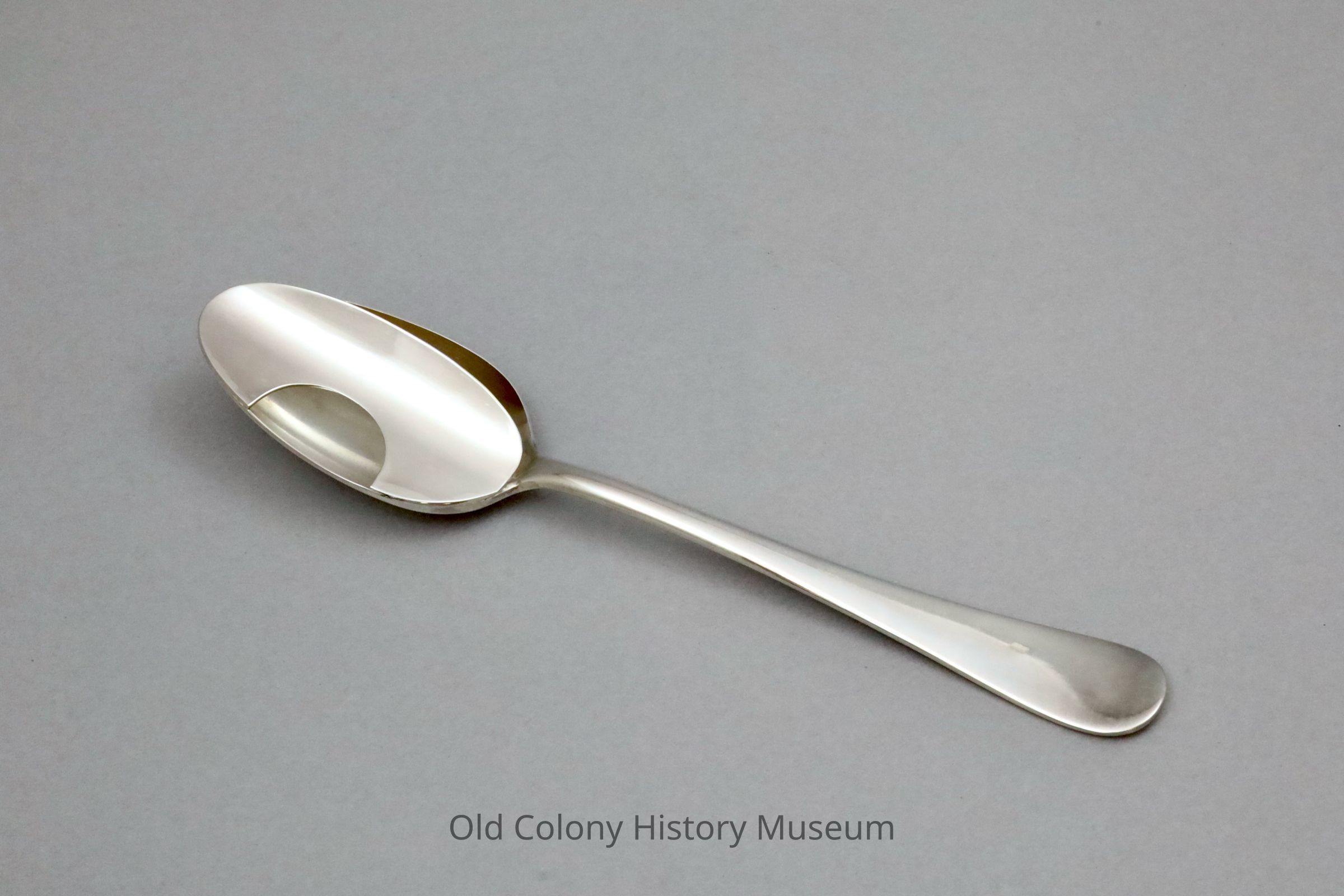 Silver plate Reed & Barton mustache spoon with pouch. (a) Spoon had stamped rounded handle and 2/3 of spoon is covered with a moustache cover with a hole for the gentleman to sip through. (b) Spoon velvet cover "N.B. Carry with you on all festive occasions."Lexicon