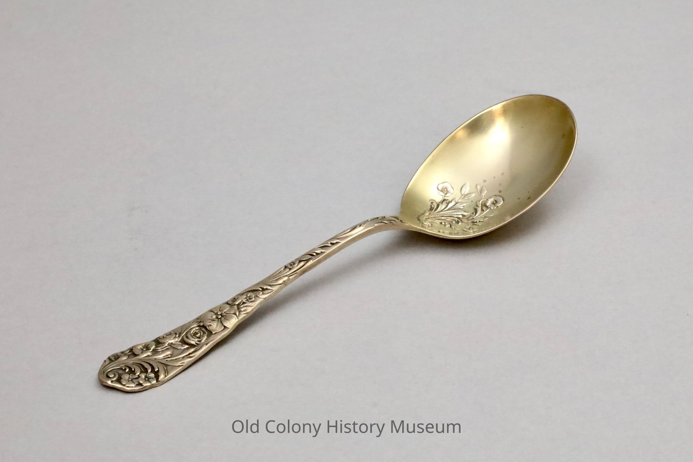 "Flora" pattern berry spoon of silver with gold enamel on bowl.