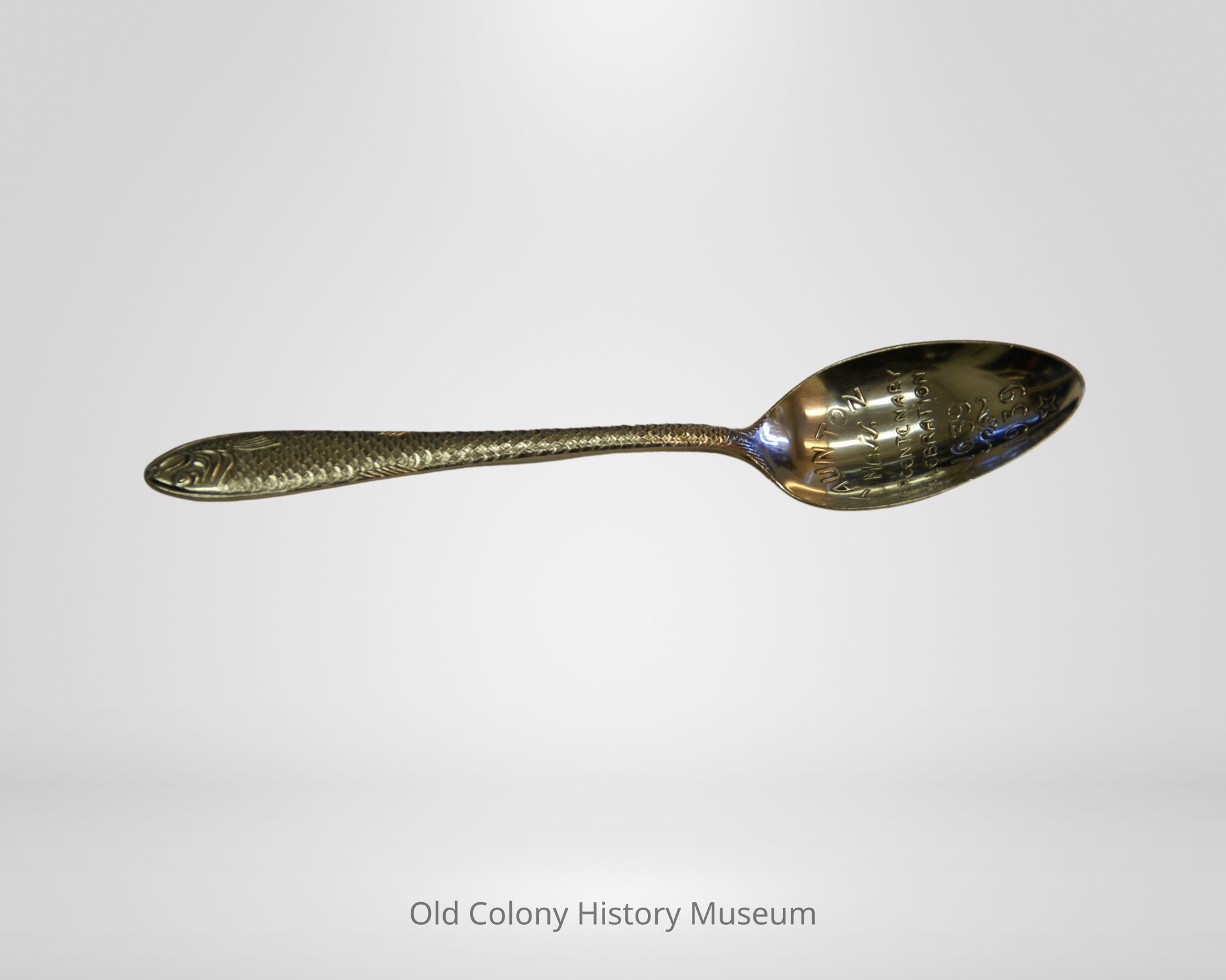 Silver plate commemorative teaspoon. Oval bowl says "Taunton Mass. Tercentenary Celebration 1639-1939" in raised lettering. A herring forms the handle with scales and the mouth and eye at the end of the spoon.Lexicon