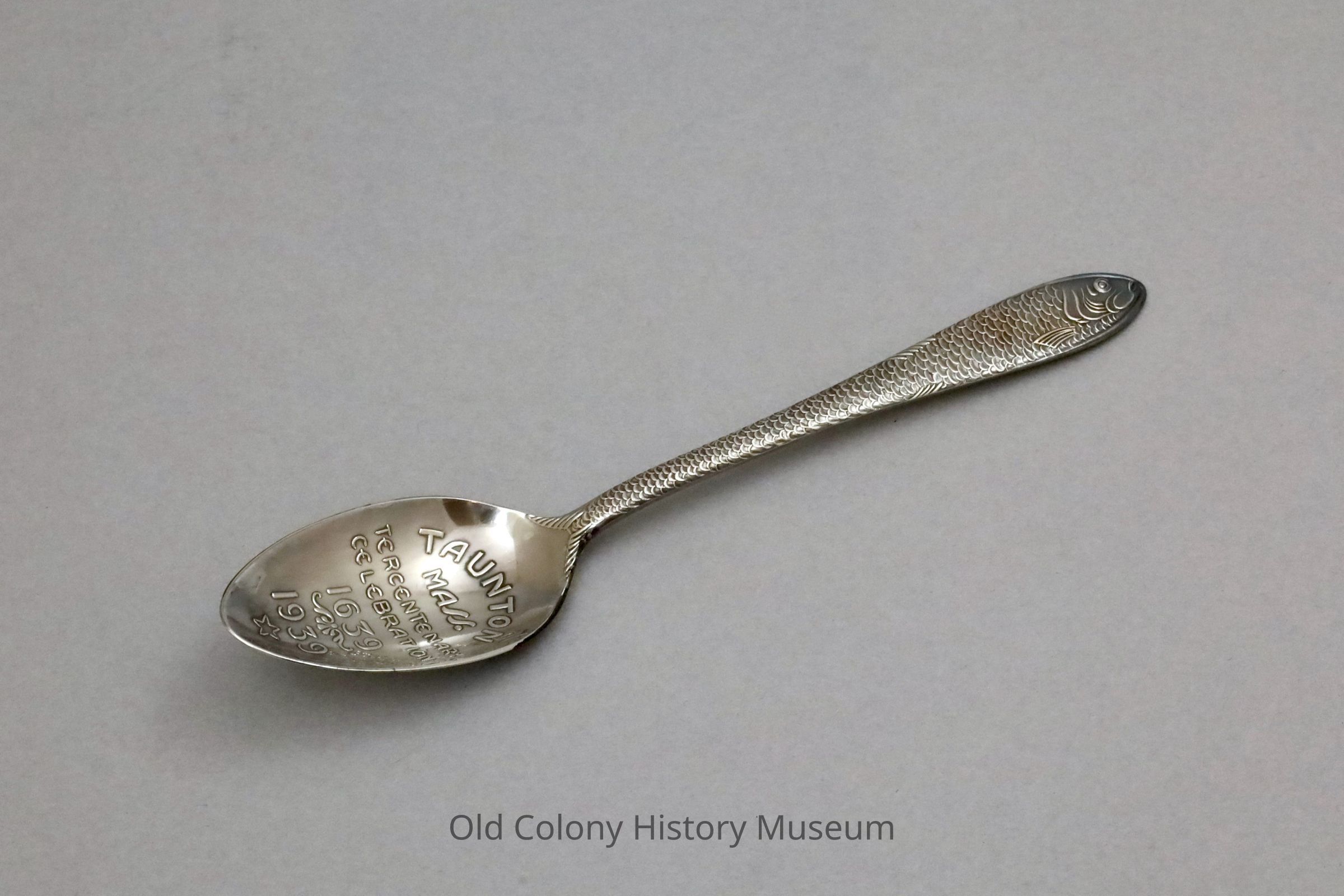 Silver plate commemorative teaspoon. Oval bowl says "Taunton Mass. Tercentenary Celebration 1639-1939" in raised lettering. A herring forms the handle with scales and the mouth and eye at the end of the spoon.Lexicon