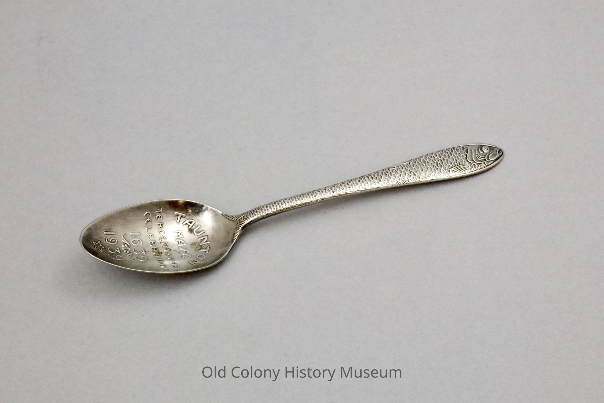 Silver plate commemorative teaspoon. Oval bowl says "Taunton Mass. Tercentenary Celebration 1639-1939" in raised lettering. A herring forms the handle with scales and the mouth and eye at the end of the spoon.Lexicon