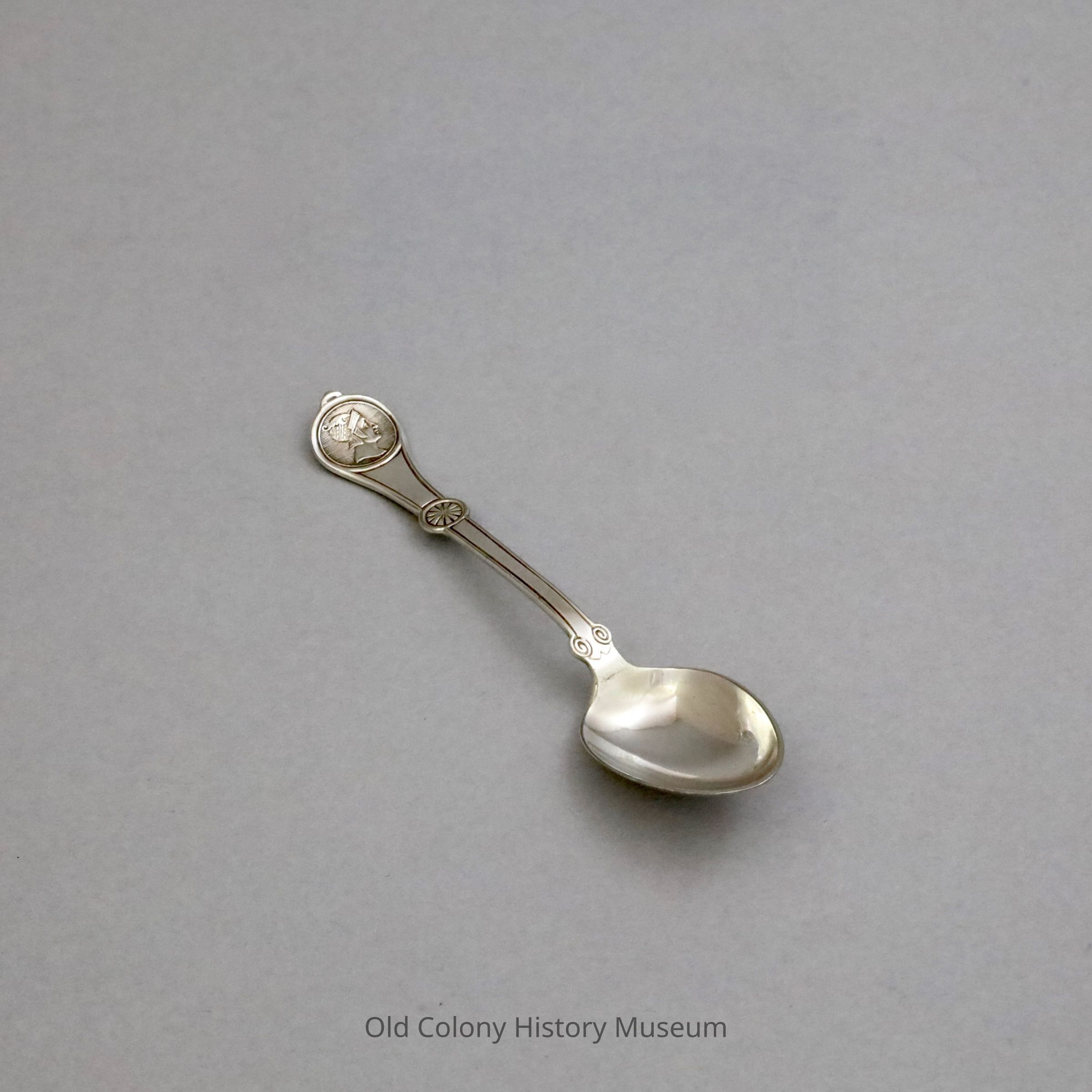 Demitasse spoon in "Roman Medallion" style. Marked "REED&BARTON 2" and "PAT.DEC.29.1868" on the reverse. Tapered handle accented with a palmette at the center and knobbed circular medallion at the end which depicts a Roman soldier.Made/Created