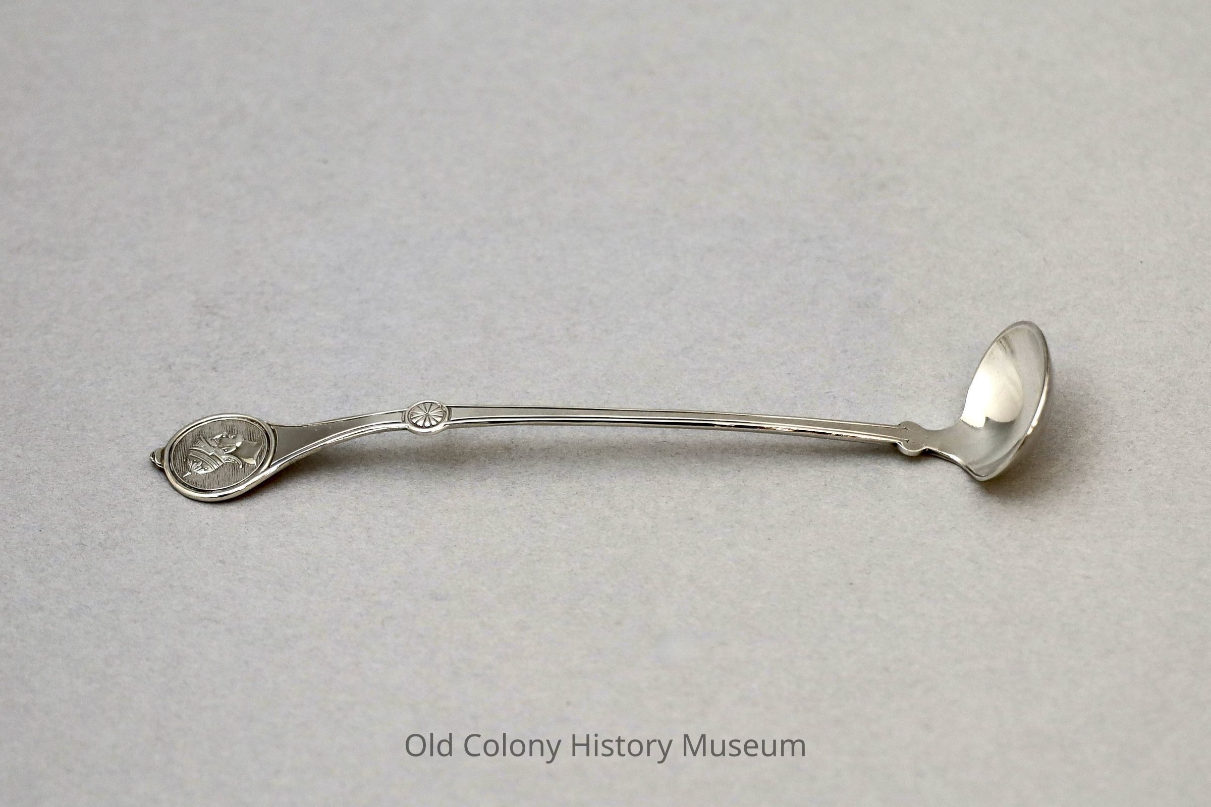 Mustard spoon with round bowl in "Roman Medallion" style. Marked "Reed & Barton." Tapered handle accented with a palmette at the center and knobbed circular medallion at the end which depicts a Roman soldier.Made/Created