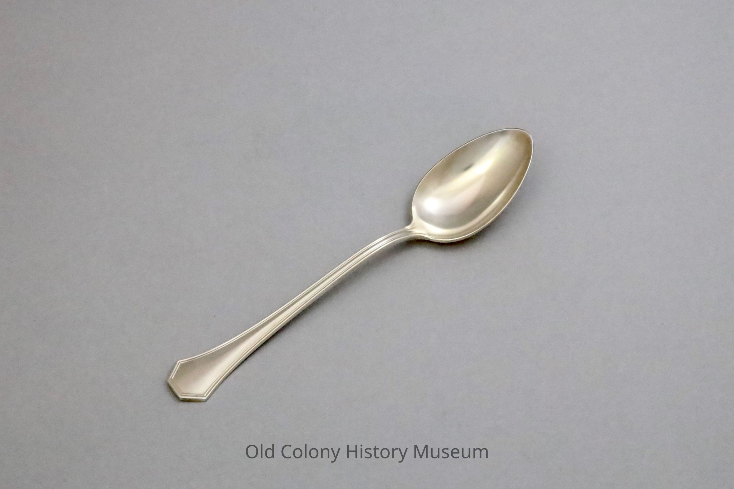 Reed& Barton silver plated serving spoon, Transfer Restaurant. Plain bowl and tapered handle. "transfer" stamped under handle. See 2001.54 and L1972.55c for similar pattern.