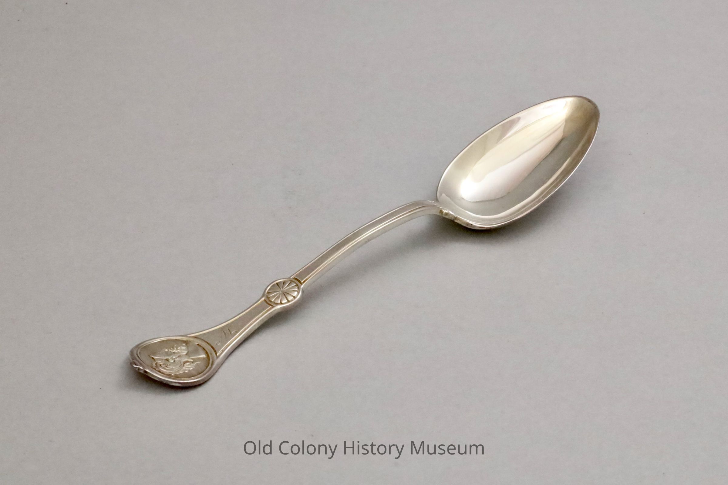 Table/soup spoon in "Roman Medallion" style. Marked "REED&BARTON 9" and "PAT.DEC.29.1868" on the reverse. Tapered handle accented with a palmette at the center and knobbed circular medallion at the end which depicts a bearded Roman soldier.Made/Created