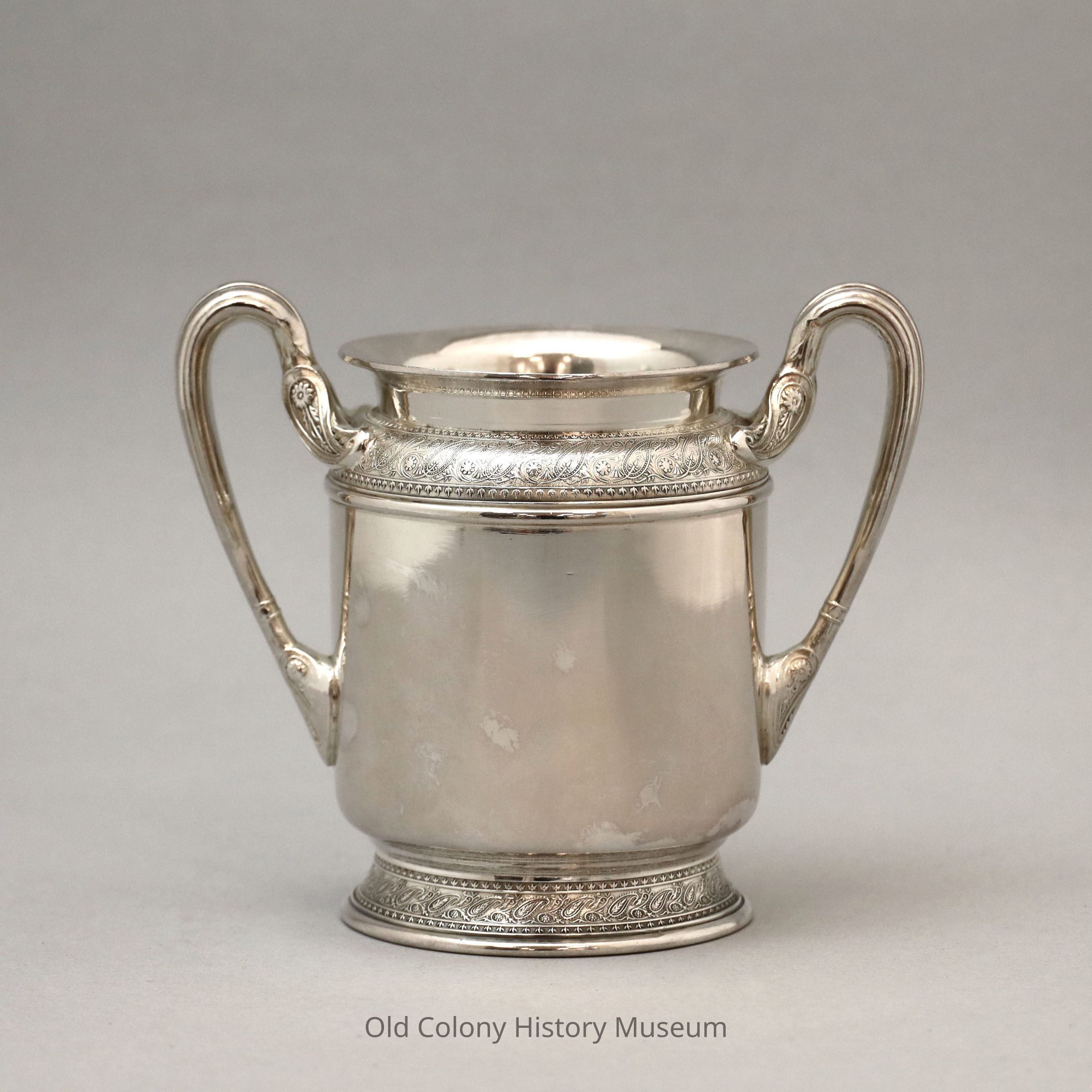 Mounted pressed decorative base for cylindrical spoon holder. Same decorative banding on shoulder and two cast handles.