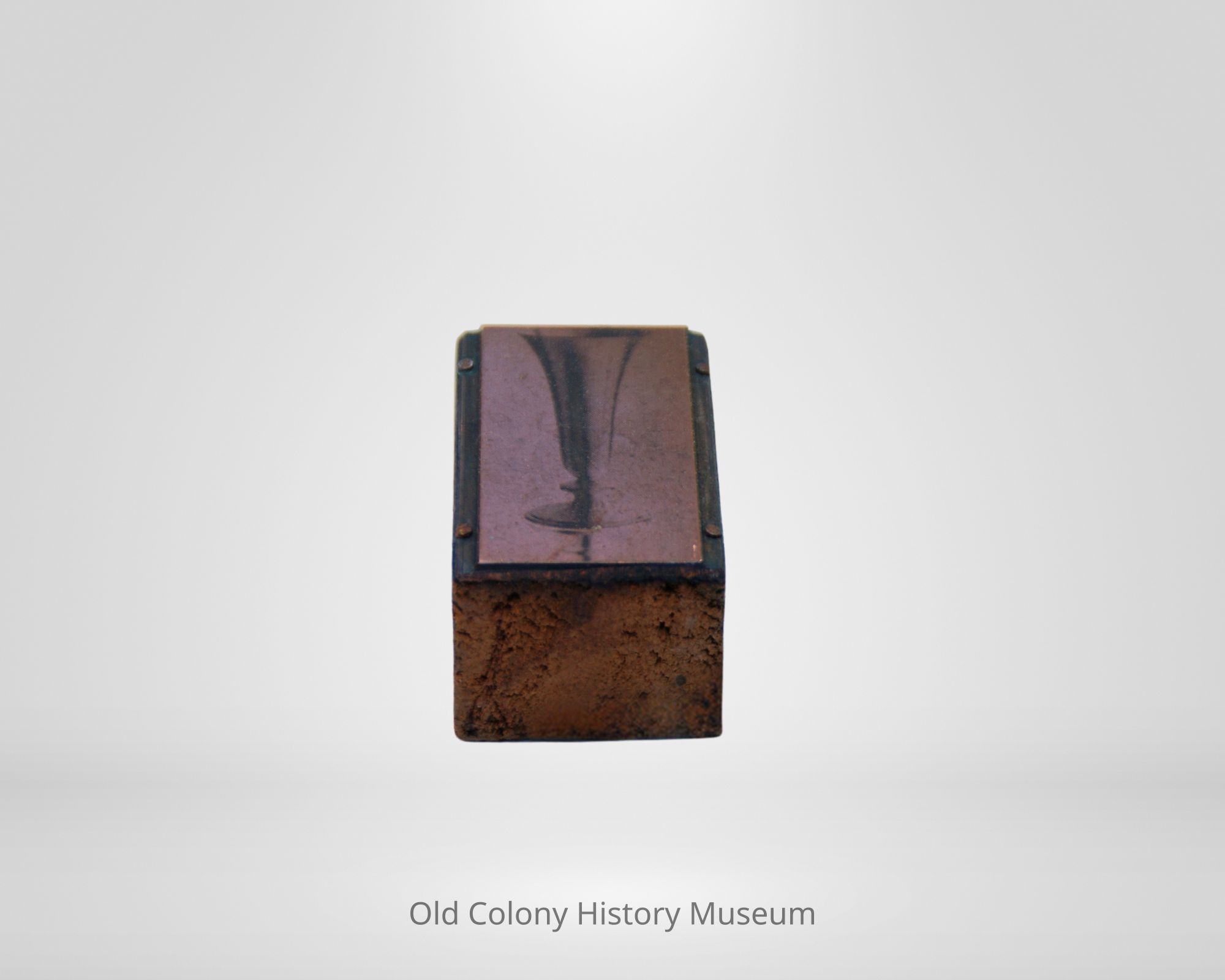 Rectangular steel stamp set on a hardwood base. Stamp has image of a pewter vase. Most likely used for catalogues and print advertisements.