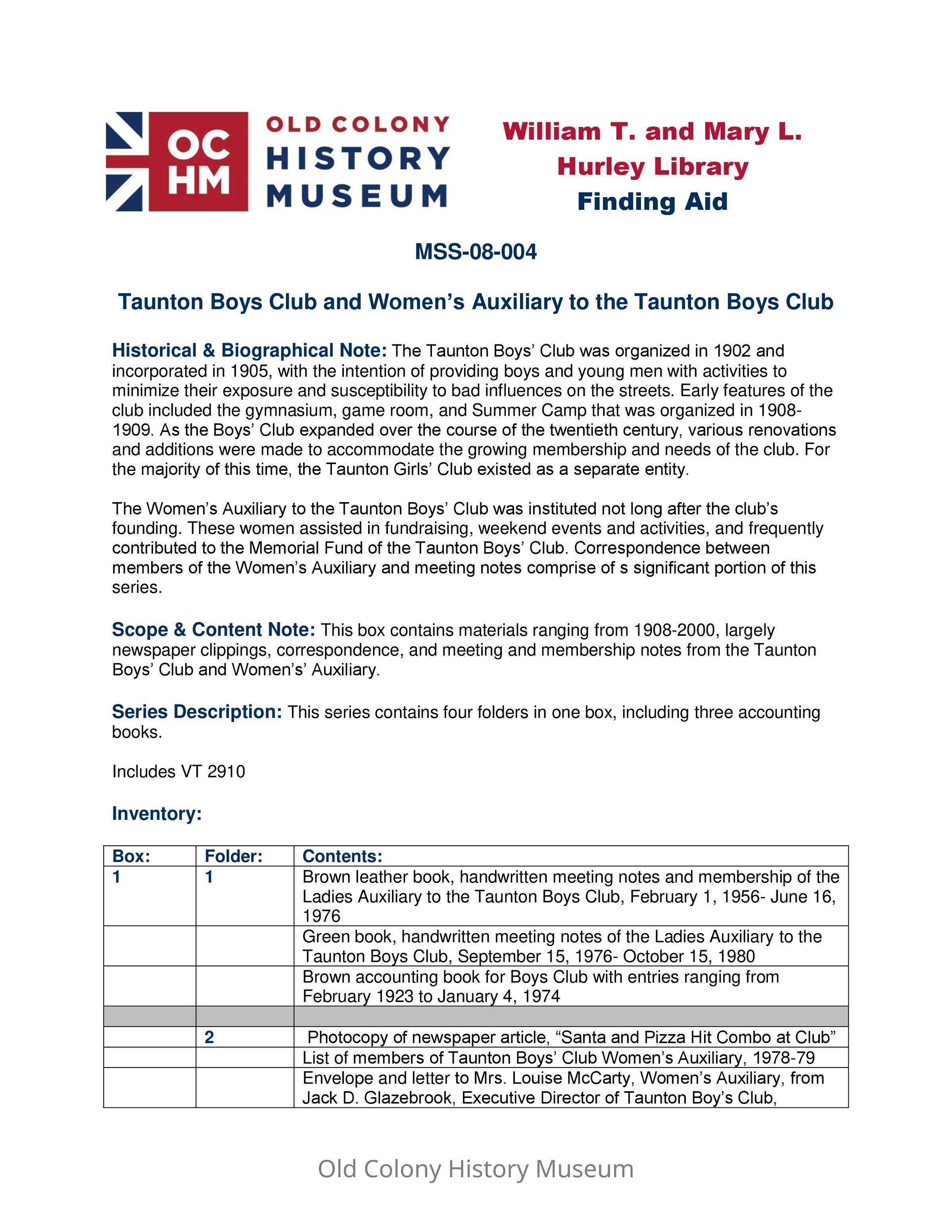 This box contains materials ranging from 1908-2000, largely newspaper clippings, correspondence, and meeting and membership notes from the Taunton Boys’ Club and Women’s’ Auxiliary.Context