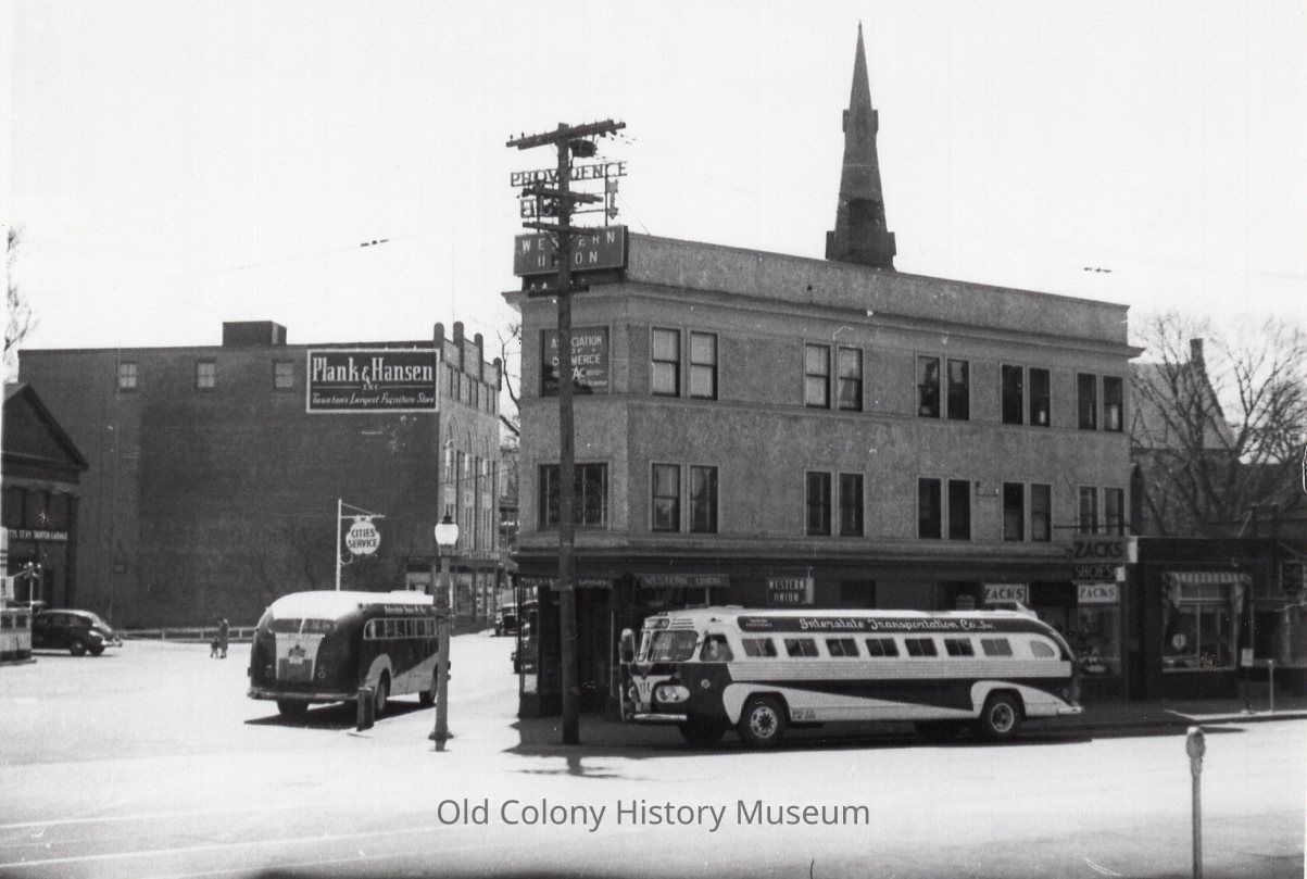 VB Taunton Green - West Side - Winthrop St. Left of Flat Iron Building - Cohannet St. on Right - C. 1948-1949Lexicon