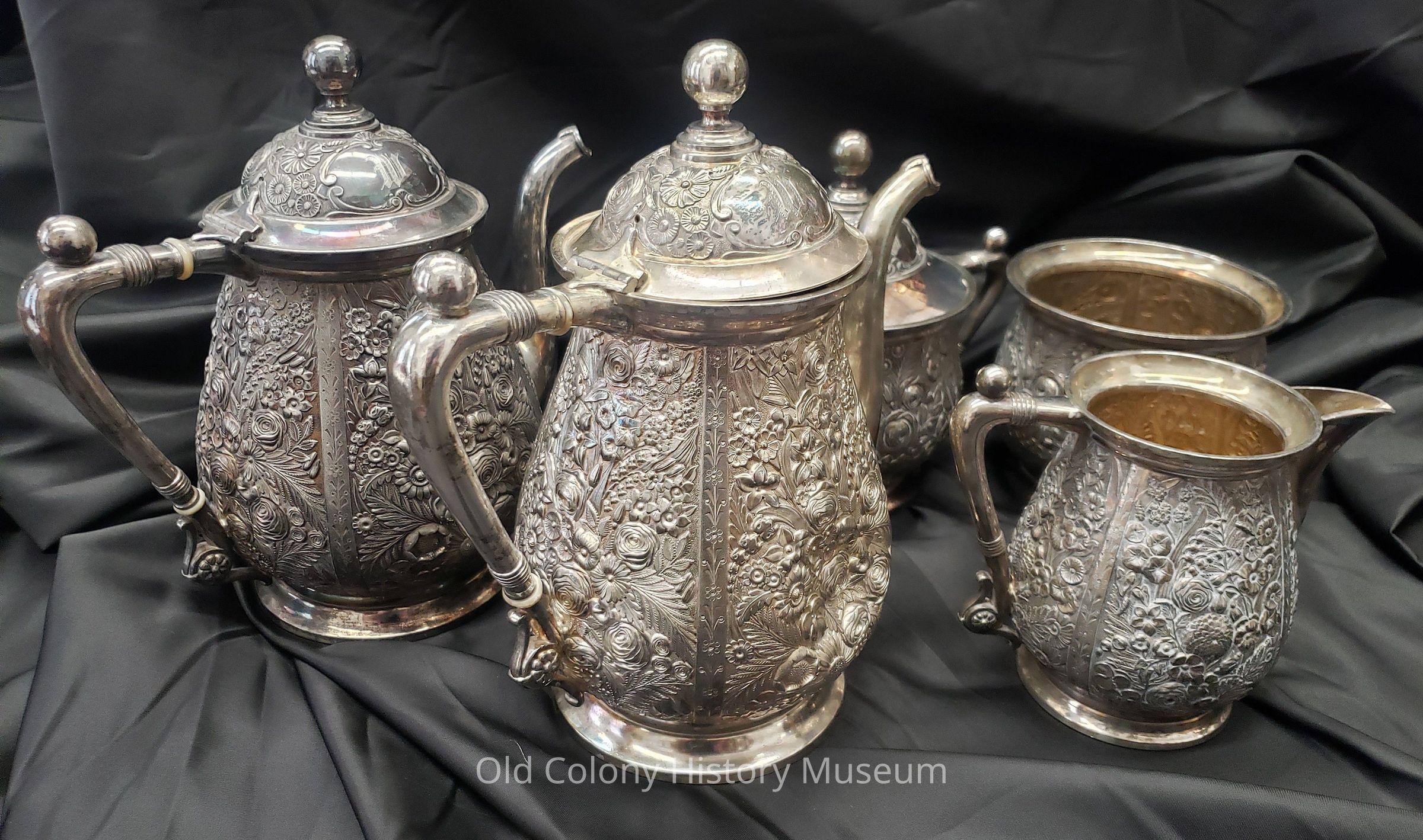 B: Teapot. Raised chased floral pattern on body, straight line segmented vertical bands; solder attached handle and spout, handle has ivory insulator band; hinged lid with "W" monogram.