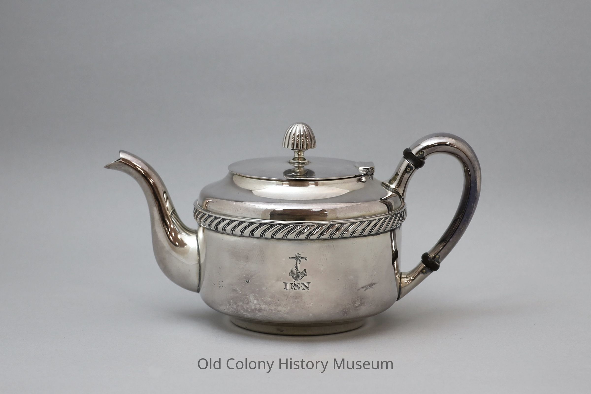 Tea pot with drum shaped body trimmed with gadrooning. Truncated dome top, flat hinged lid, reeded finial; ear-shaped handle with 2 ebony ferules, flared spout. Anchor and "U.S.N." engraved on the front.Made/Created