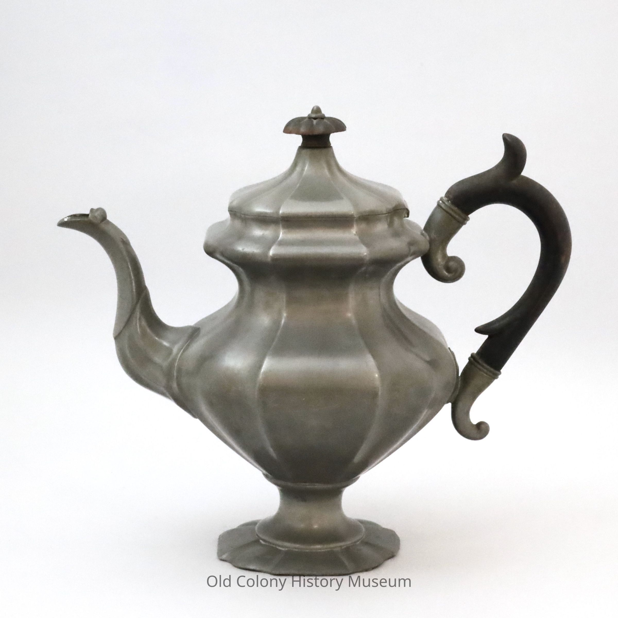Britannia Tea Pot, made by Leonard, Reed& Barton. Molded teapot with faceted octagonal body, lid, and base. Hinged lid has wooden flower finial. Gadrooning along lower edge of S-shaped spout. Curved wooden handle with two spurs and scrolled ends. Marked: "3500 Leonard, Reed & Barton 6."Lexicon