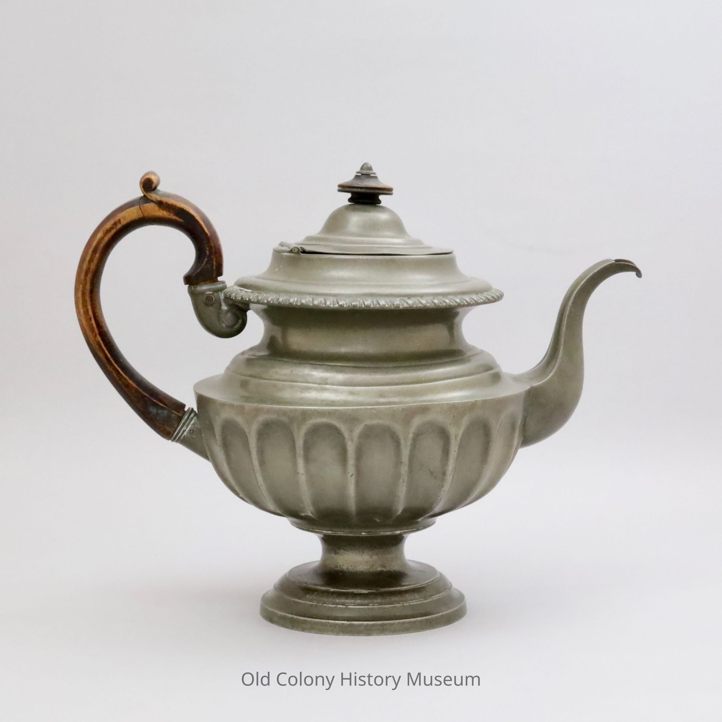 Teapot with fluted body, concave neck, and a gadrooned rim on base. Hinged lid with wooden finial and attached wooden handle.Made/Created