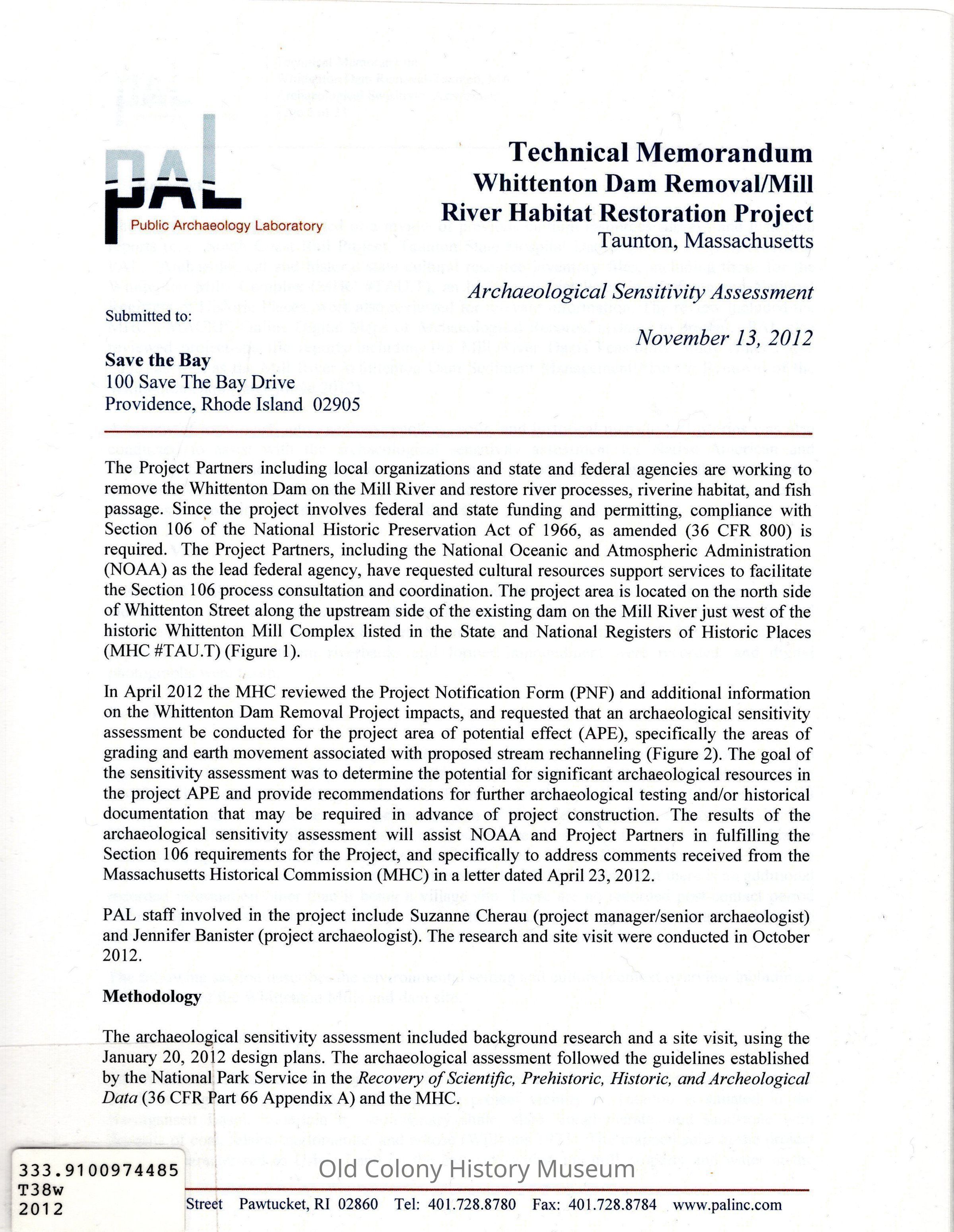 Mill River habitat restoration project, Taunton, Massachusetts, Archaelogical Sensitivity AssessmentPublisher