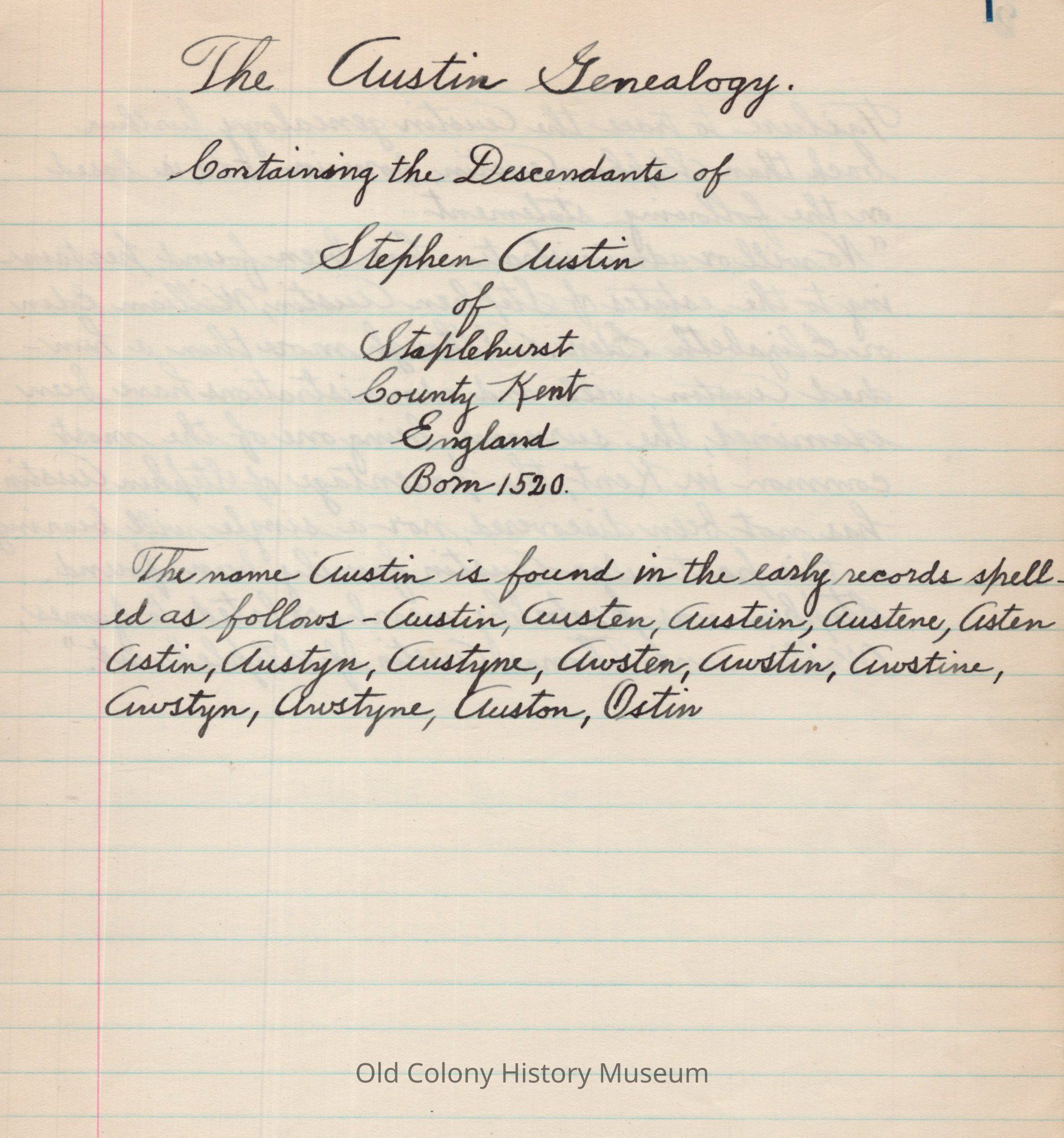 The Austin Genealogy Containing the Descendants of Stephen Austin of Staplehurst, County, Kent, England: Born 1520.