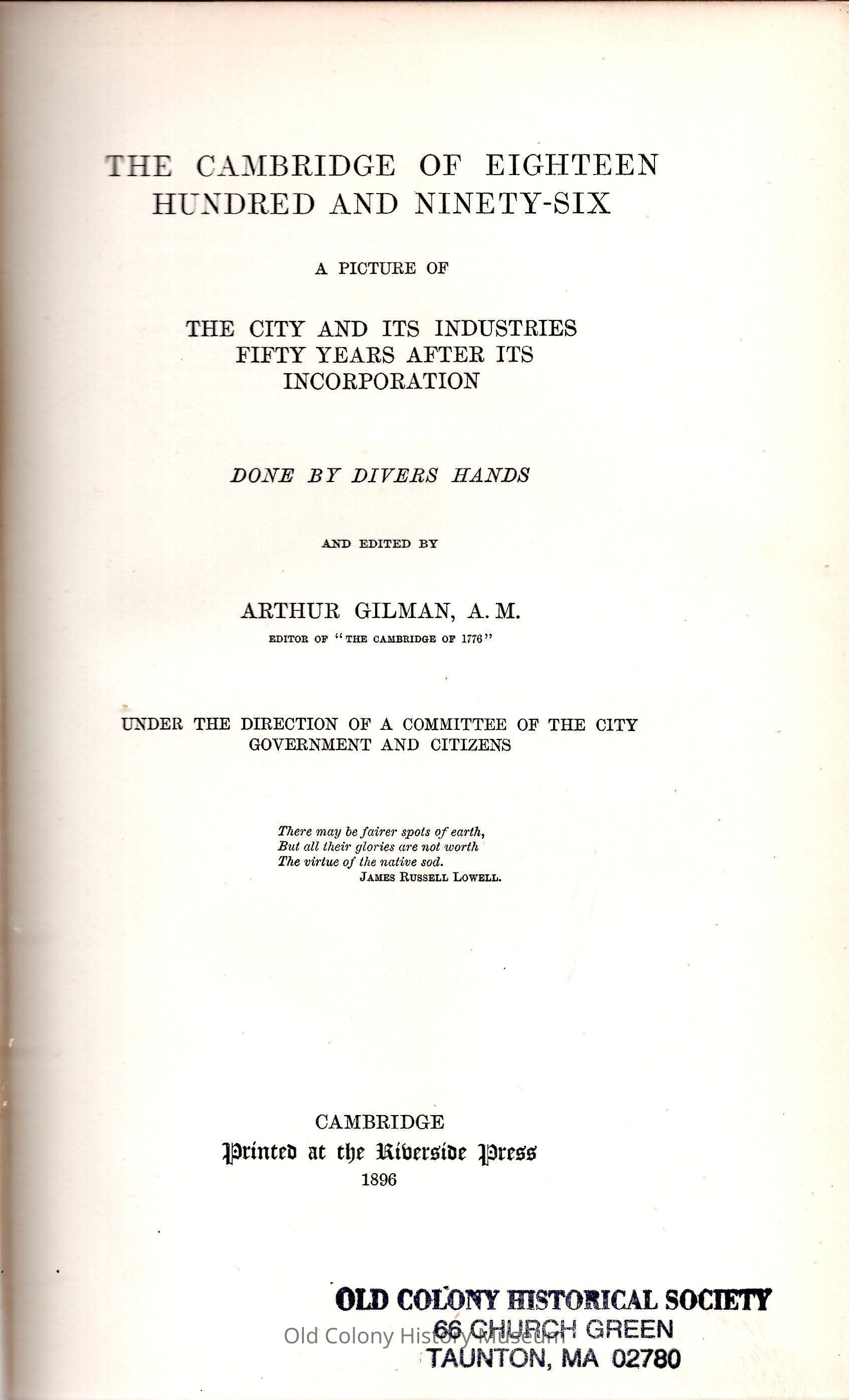 The Cambridge of Eighteen Hundred and Ninety-Six. A picture of the city and its industries fifty years after its incorporation. Done by divers hands and ed. By Arthur Gilman under the direction of a committee of the city government and citizens...Entry/Object ID