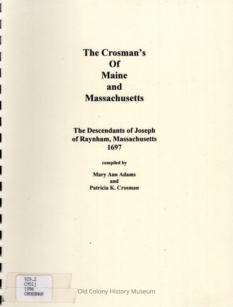 The Crossman's of Maine and Massachusetts: The Descendants of Joseph of Raynham, Massachusetts, 1697Entry/Object ID